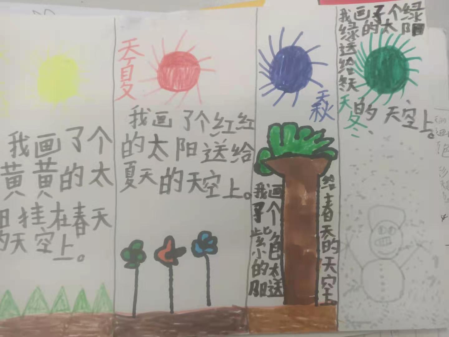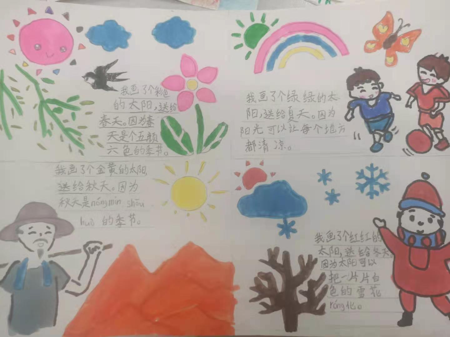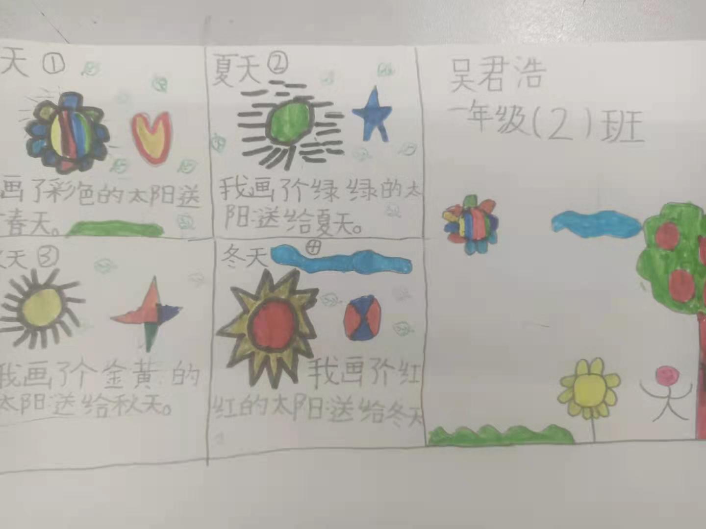 小学一年级的学生,由于年龄小,儿童情趣很浓,厌烦呆板生硬,喜欢生动有趣等方面的特点。因此,我们只有巧妙地设置学生作业, 将学习寓于玩乐、寓于生活、寓于探究之中,设计趣味性作业、实践性作业以及探索性作业,将语文作业的设计与学生生活相联系,才能让学生更好地巩固所学的语文知识。 教完《四个太阳》一课,课后有这样一题:说说你会为每个季节画什么颜色的太阳,试着画一画,并说明理由。我让孩子们在课堂上仿照《四个太阳》一课,先自己说一说。当时孩子们就跃跃欲试。然后我就让孩子们画不同颜色的太阳,并用一两句话说明理由,表达自己美好的愿望。 孩子们兴趣相当浓,个个展开想象的翅膀,马上埋头画了起来,你瞧!
