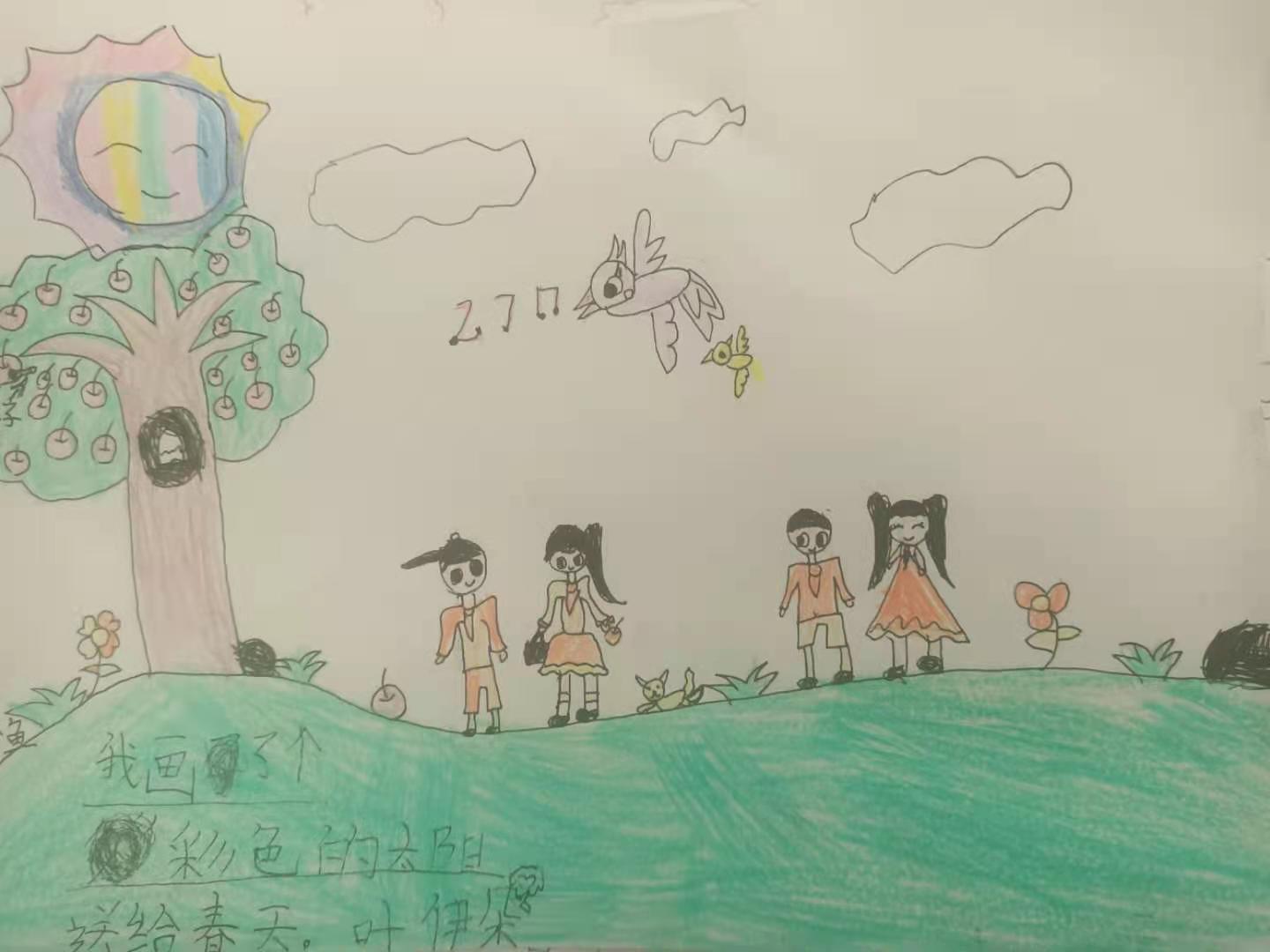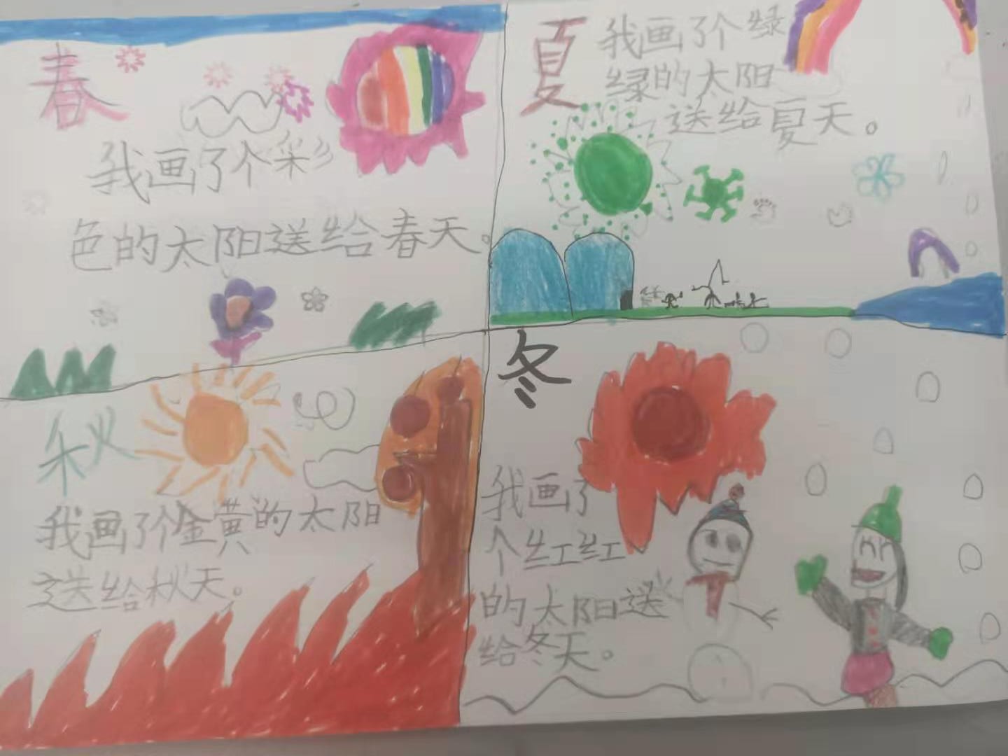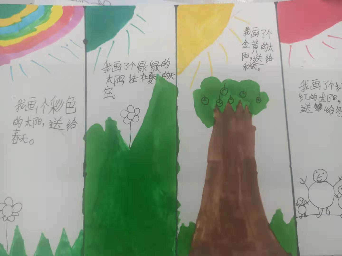 小学一年级的学生,由于年龄小,儿童情趣很浓,厌烦呆板生硬,喜欢生动有趣等方面的特点。因此,我们只有巧妙地设置学生作业, 将学习寓于玩乐、寓于生活、寓于探究之中,设计趣味性作业、实践性作业以及探索性作业,将语文作业的设计与学生生活相联系,才能让学生更好地巩固所学的语文知识。 教完《四个太阳》一课,课后有这样一题:说说你会为每个季节画什么颜色的太阳,试着画一画,并说明理由。我让孩子们在课堂上仿照《四个太阳》一课,先自己说一说。当时孩子们就跃跃欲试。然后我就让孩子们画不同颜色的太阳,并用一两句话说明理由,表达自己美好的愿望。 孩子们兴趣相当浓,个个展开想象的翅膀,马上埋头画了起来,你瞧!