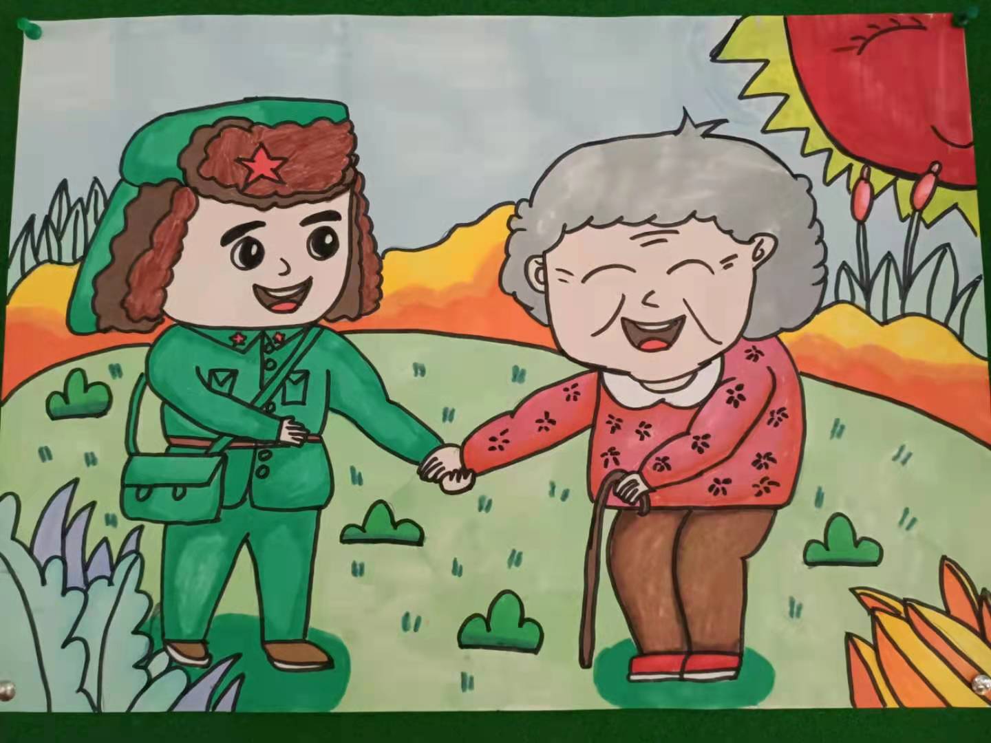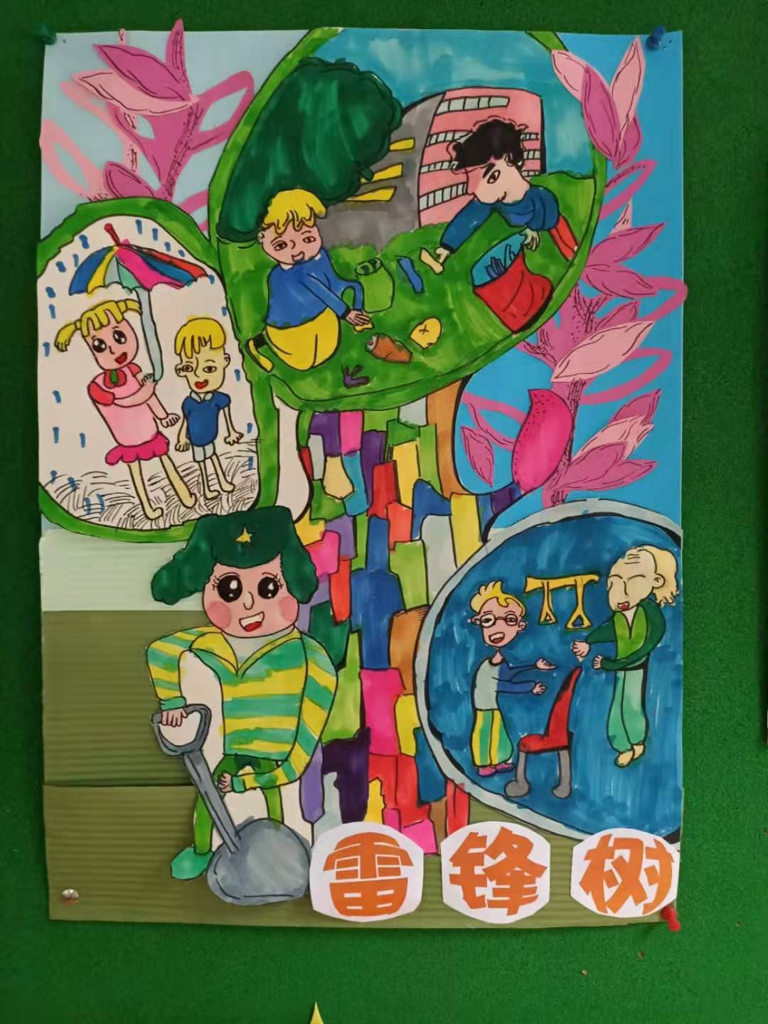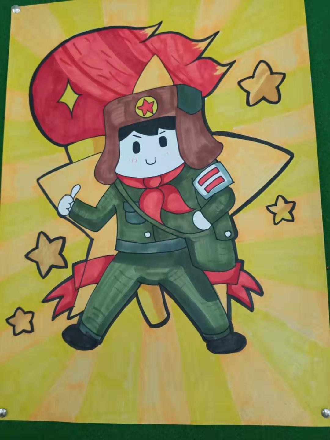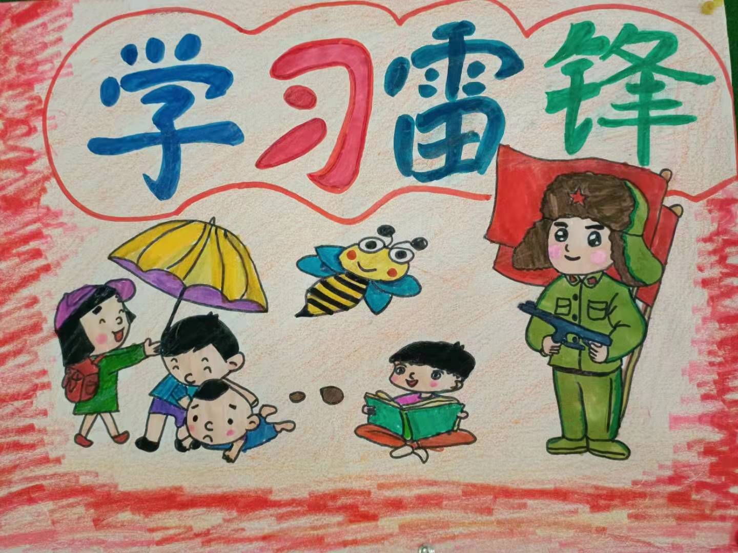 特色评价(二)——画雷锋 三月份,为了提高学生的阅读、书写、设计绘画等多方面能力,增加学生的识字量,结合学校开展的学雷锋活动,我在班级里进行一次“弘扬雷锋精神,争当四品八德好少年”绘画比赛。全班小朋友先在班会课上了解雷锋,学习雷锋叔叔的先进事迹,再要求统一阅读《雷锋故事》这本书。然后在规定的时间内完成绘画作品,先在班级里评出一、二、三等奖,再把一等奖的作品送到学校参评。每个孩子都能在家长的帮助下,出色地完成作品,并在学校的评比中获得一、二、三等奖的好成绩。 优秀作品展示