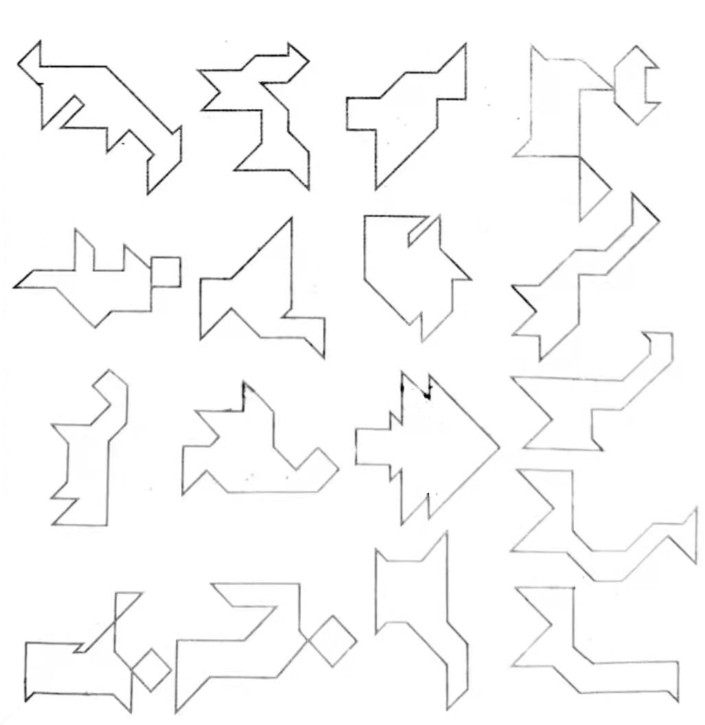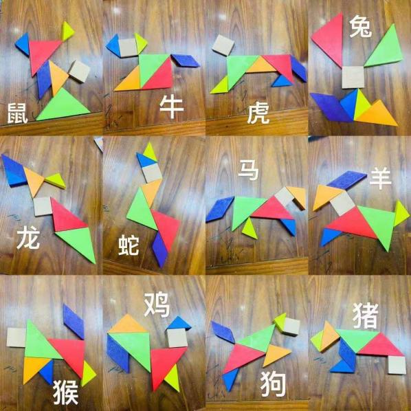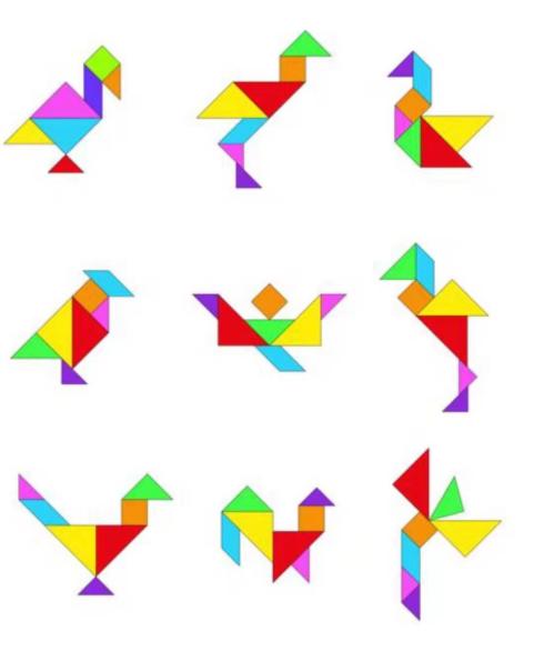 七巧板,红蓝黄,有方有角又有长,你拼车,我搭房,大家玩得喜洋洋!七块小板都用到,不能多来不能少,不能重叠,不能离,七块小板紧紧靠,先想想,再拼拼。 拼拼、想想有创造。依图成型活动中,孩子们利用七巧板拼成自己喜欢的图案,说出每个位置使用的形状。策略一:用好大三角形的组合,可以很快地确定图形的主题部分,不如鸟类拼图中,两块大三角形的组合可以很好地拼成身体部分,也可以把这种方法类推到动物的身体部分。策略二:平行四边形的运用,也可以起到至关重要的作用。策略三:对比图形边长长度的倍数,感受哪些图形可以拼接在一起。 第一阶段的活动时间安排了一个星期,每天练习5个图案,要求照着图形拼图,第二次练习时,一个图形观察20秒后,移开图形在凭着位置拼出图形再对比原图,哪些位置是正确的,哪些是错误的,如果在拼一次,你会了吗?直至正确后方可练习第二个图案。 第二阶段项目:见影排形