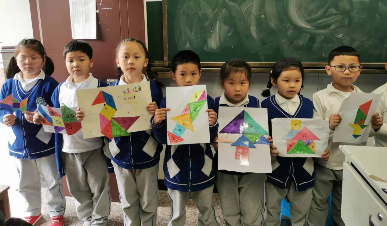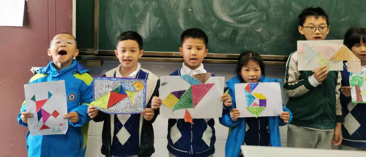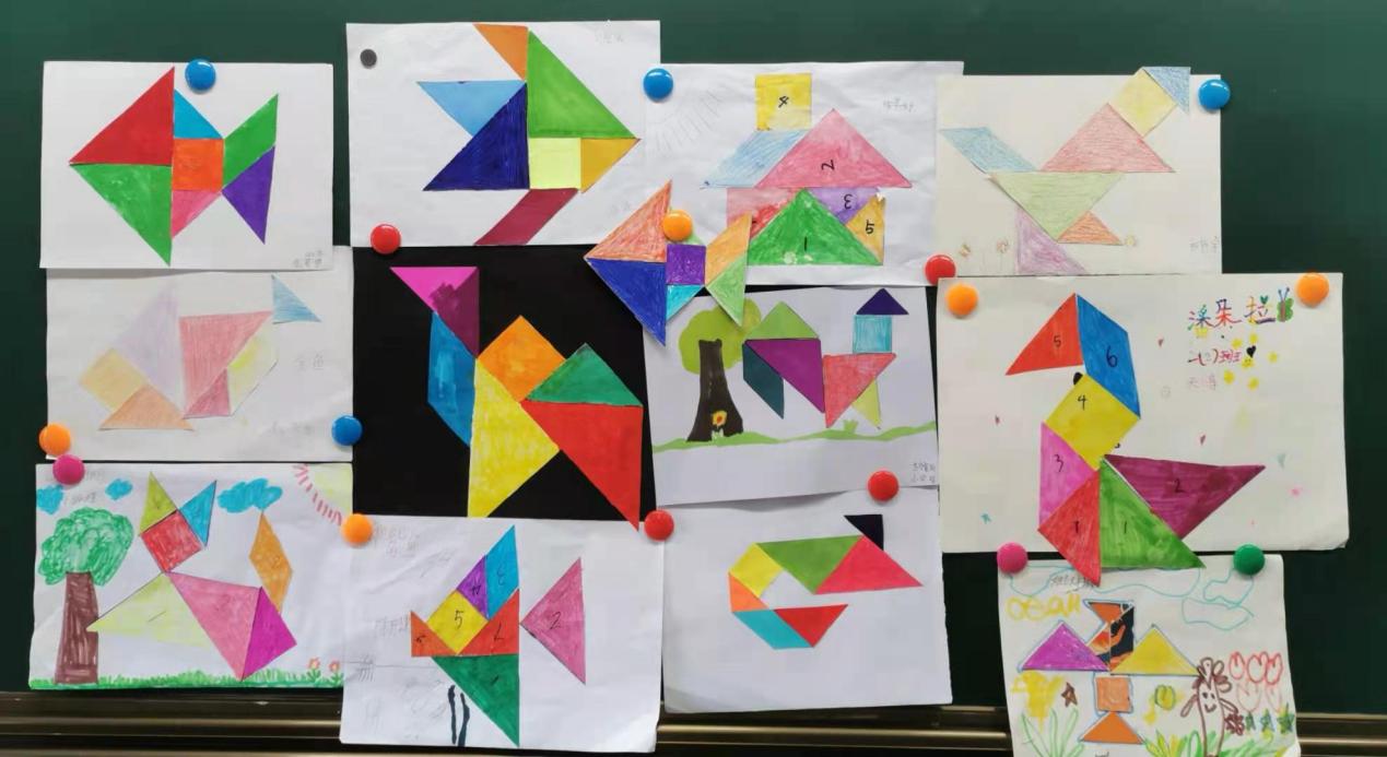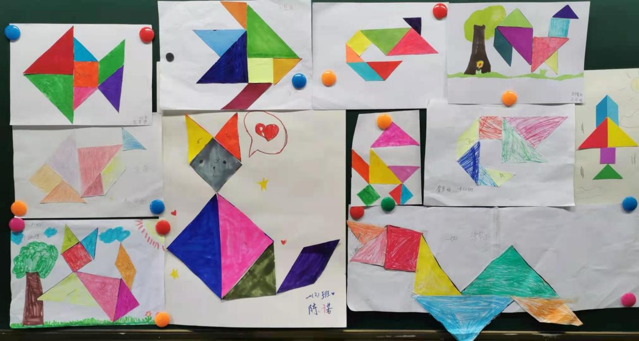 结合视频,介绍七巧板的制作过程,让学生采用正方形,制作自己的七巧板,并设计一副自己喜欢的图案。孩子们一个个奇妙的构想,一份份新颖的创意,一幅幅精美的图案,小小七巧板,带领孩子们走进了美丽的图形世界…… 下面是孩子们的作品展示: