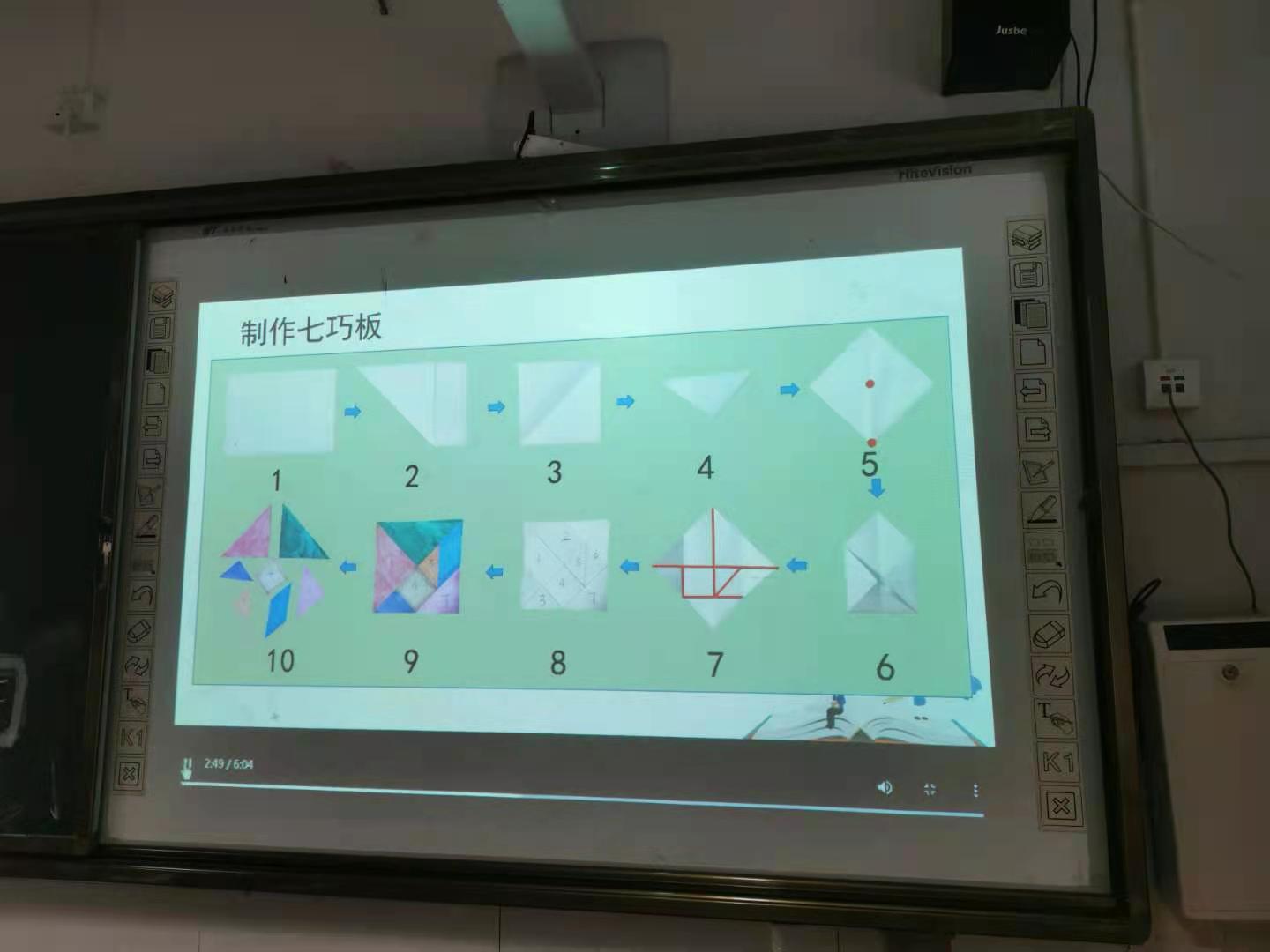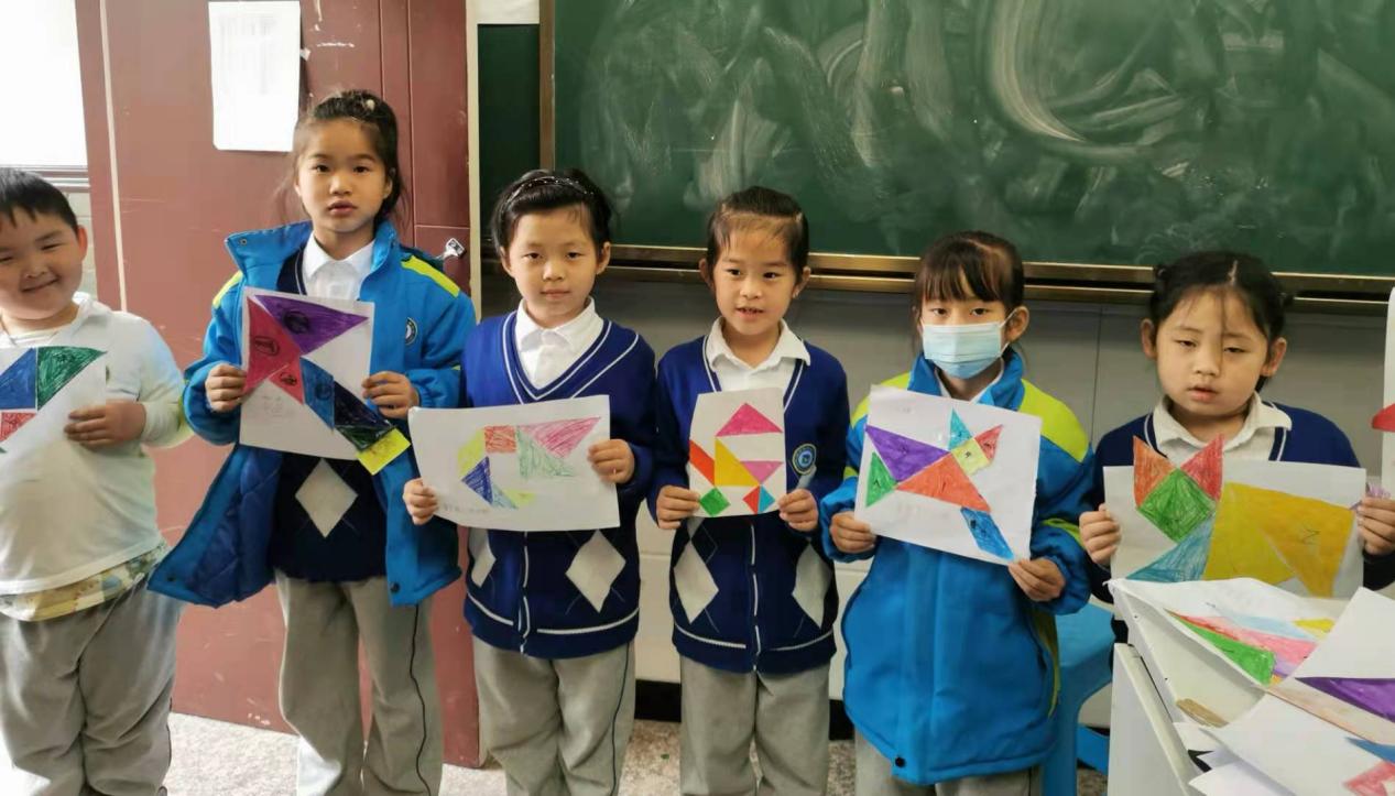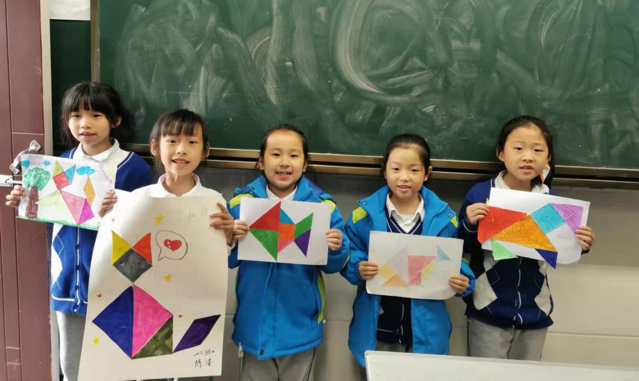 结合视频,介绍七巧板的制作过程,让学生采用正方形,制作自己的七巧板,并设计一副自己喜欢的图案。孩子们一个个奇妙的构想,一份份新颖的创意,一幅幅精美的图案,小小七巧板,带领孩子们走进了美丽的图形世界…… 下面是孩子们的作品展示: