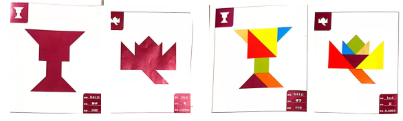 老师会带着孩子们循序渐进,把找关键特征、旋转、翻转,拼合、分合等等平面几何的重要知识,等孩子了解每一块七巧板之间的关系,并且熟练操作每一块之间的拼接,包括相同形状之间的替换方法,再让孩子去进行拼接图案,这时候的理解才会更透彻。当孩子掌握了这种难度的盲拼之后,基本已经把七巧板玩得很透彻啦,而隐藏在七巧板中的数学知识,也被一一吃透,当孩子在之后学习边长、面积、比例等数学知识的时候,只要想到自己玩过的七巧板,理解起来也就很简单了! 第四阶段项目:自创图形