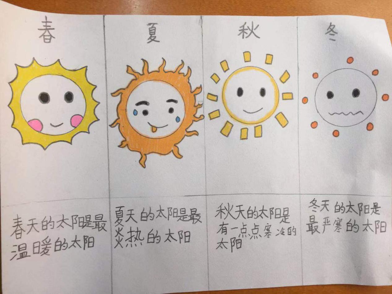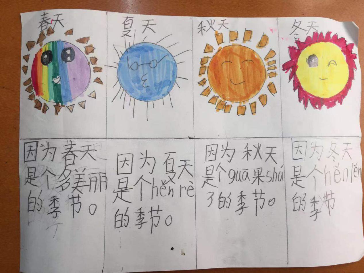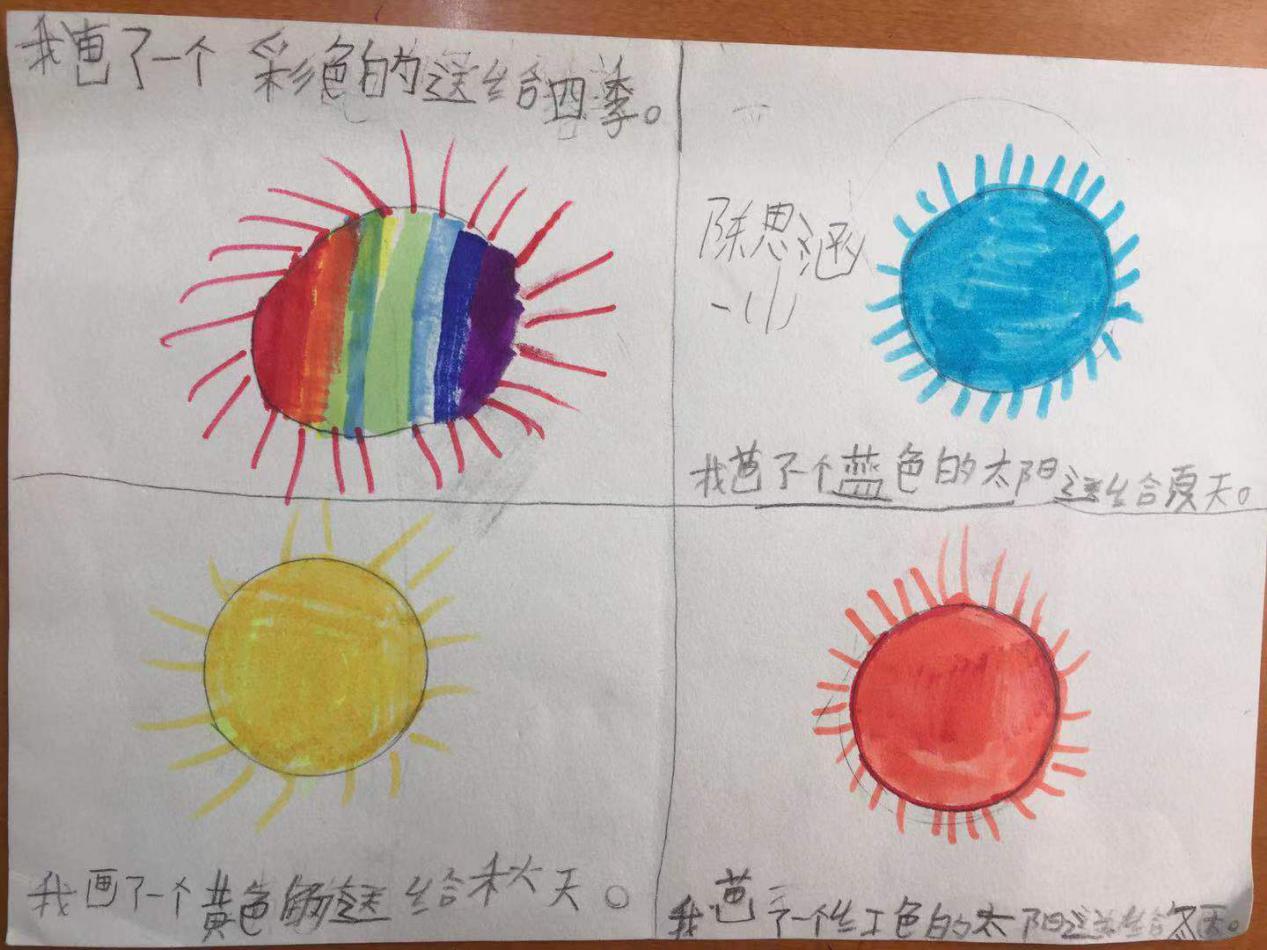 一年级语文郑燕南3月特色评价 画太阳 一、活动目的:小学一年级的学生,由于年龄小,儿童情趣很浓, 主动性不强,自理能力差,厌烦呆板生硬,喜欢生动有趣等方面的特点。于是,我们只有巧妙地设置学生作业, 将学习寓于玩乐、寓于生活、寓于探究之中,设计趣味性作业、实践性作业以及探索性作业,将语文作业的设计与学生生活相联系,让学生联系学校、家庭、社会来巩固所学的语文知识。 二、活动内容: 画太阳,写太阳 三、活动方法与要求:《四个太阳》一课有这样一题,说说你会为每个季节画什么颜色的太阳,试着画一画,并说明理由。我让他们在课堂上参照《四个太阳》一课,先自己说一说。当时孩子们就跃跃欲试。然后我就让孩子们画不同颜色的太阳,并用一两句话说明理由,孩子们兴趣很好,就有了以下的收获。