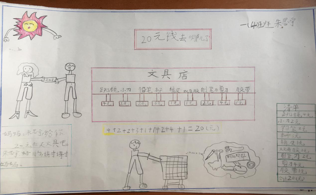 活动体会:选购商品,和售货员沟通,估计自己带的钱够不够,哪家商品更划算等等问题,好像都很值得挑战,用数学的方式记录,还能加入自己的情感和体验,孩子们的作品值得学习和交流。当学生带着自己的作品,并作为学习的材料时,孩子们有话说,也能说,同伴之间也成了学习的资源和学习的榜样,这样的实践活动带给孩子不一样的收获。