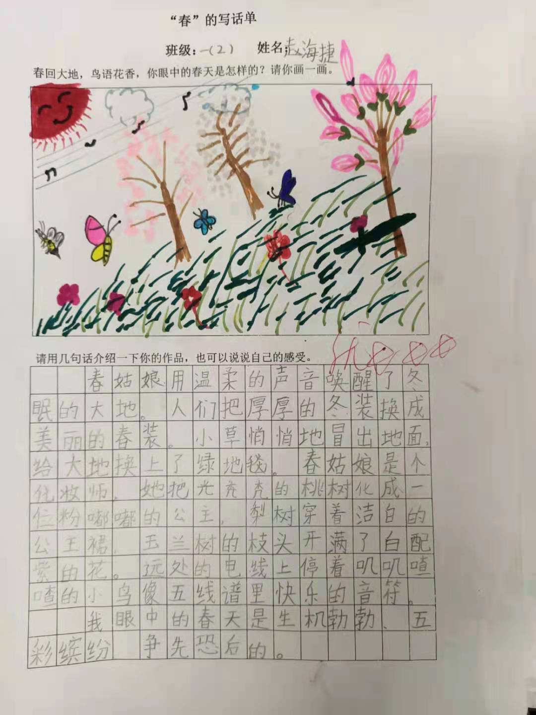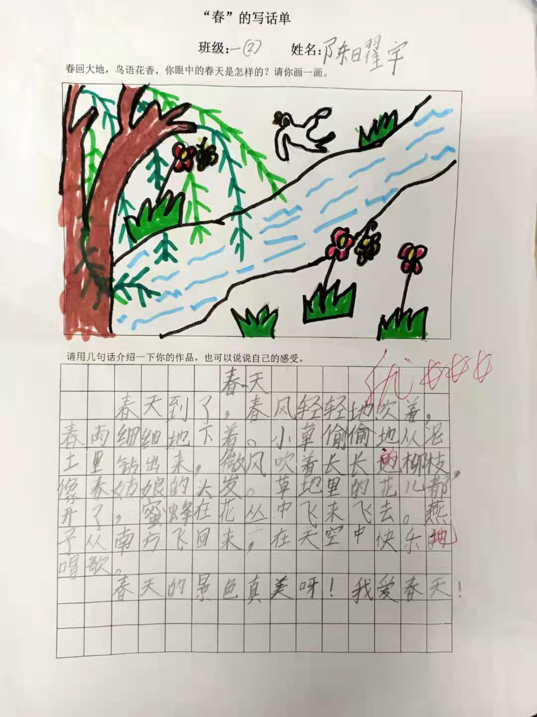 上交作业了, 孩子们一张张图文并茂的作业纸展现在我眼前,让我耳目一新,不胜欢喜,那里有青青的小草,粉红的桃花,碧绿的柳枝,快乐的小鸟,飞舞的蝴蝶…… 让我们一起来欣赏吧!