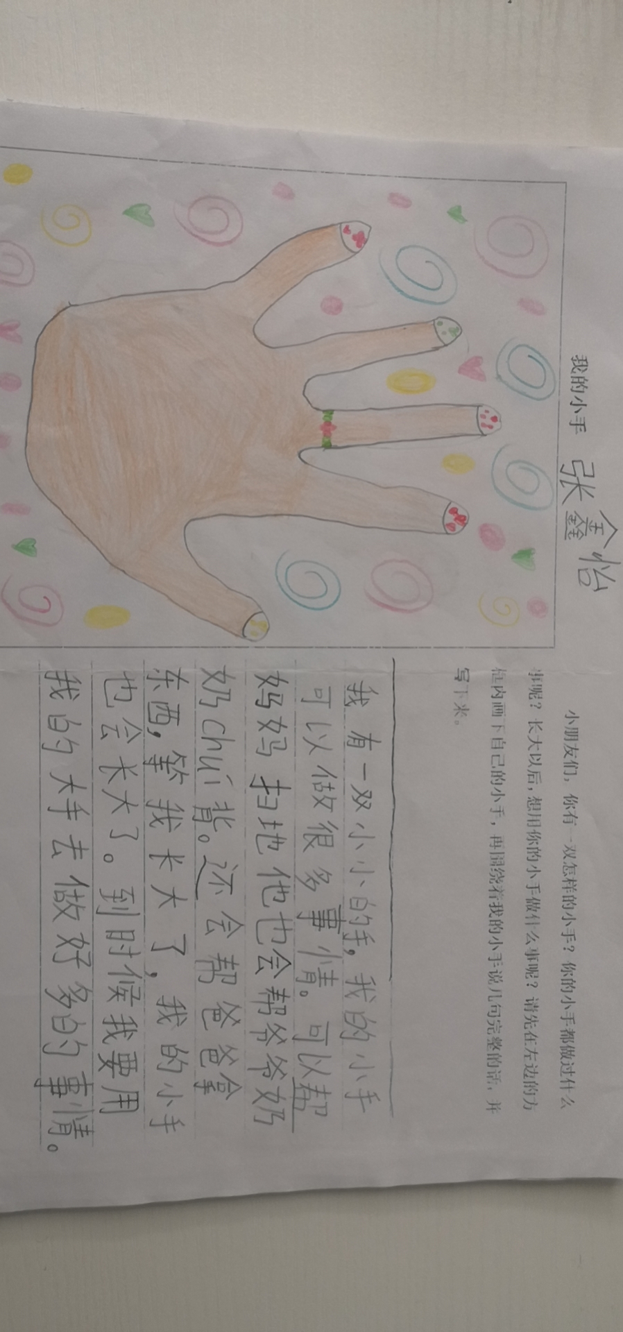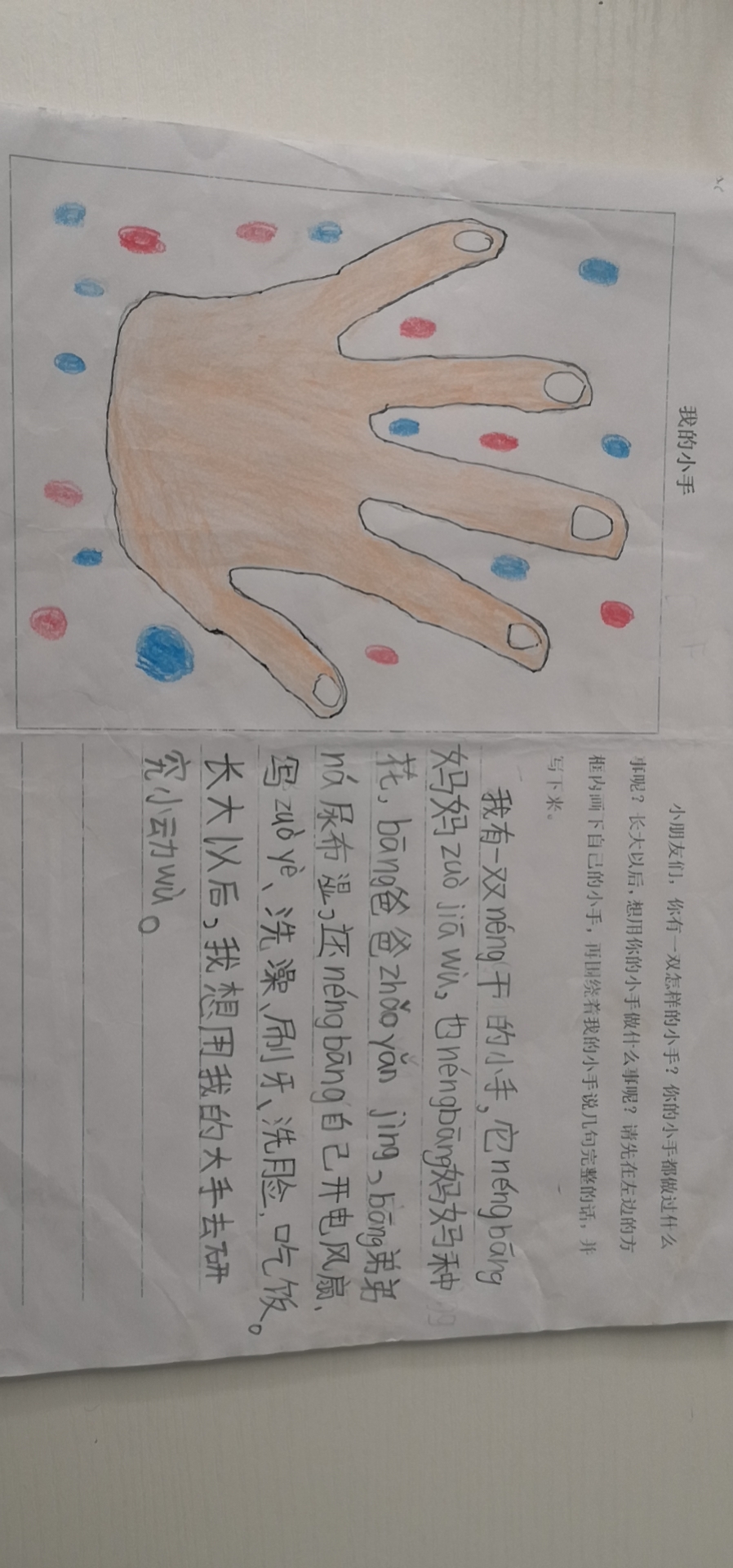 语文园地三“和大人一起读” 《胖乎乎的小手》时,给孩子带回一张绘画写话纸,让家长在和孩子一起读文章后,一起观察自己的小手,请孩子回忆小手都会干什么?想想长大后准备用这双手干什么。然后画出“小手”,把说的话写下来。