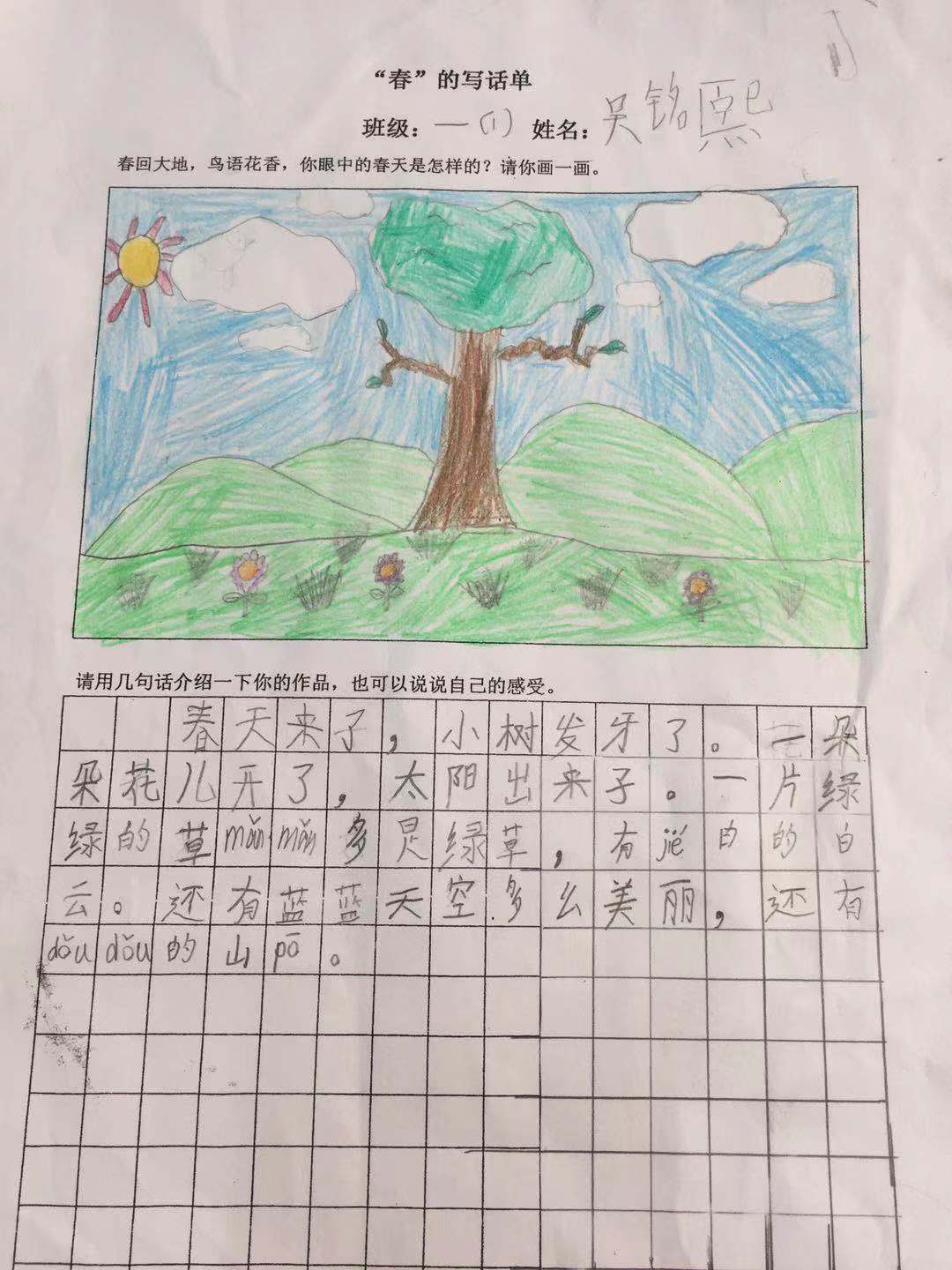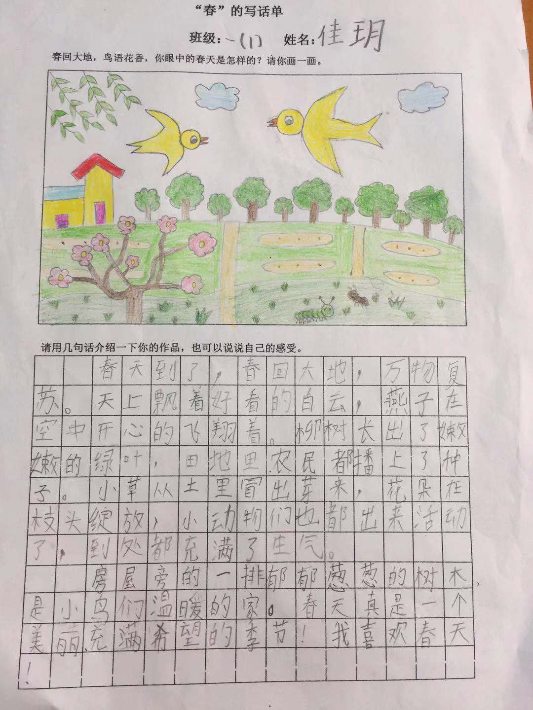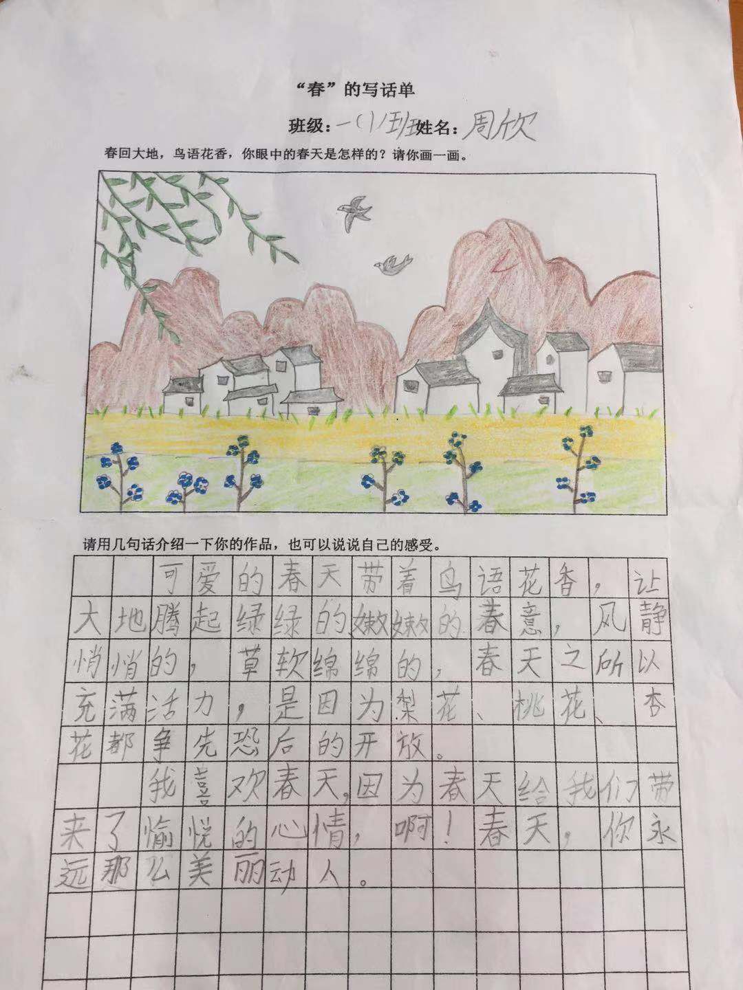 指导《春天》这一主题时,我先问孩子:“结合我们这一单元的课文内容,再想想我们上学路上所看到的,你们说说春天里大自然是怎样的,都有什么景色?”学生们说的时候,我相机引导学生把话说通顺、用词准确。然后我说:“写话并不难,把你们想到的,以及刚刚所描述的画一画,写一写,你们就都是画家、作家了。”听了我的鼓励,学生兴致盎然地提笔绘画、书写。
