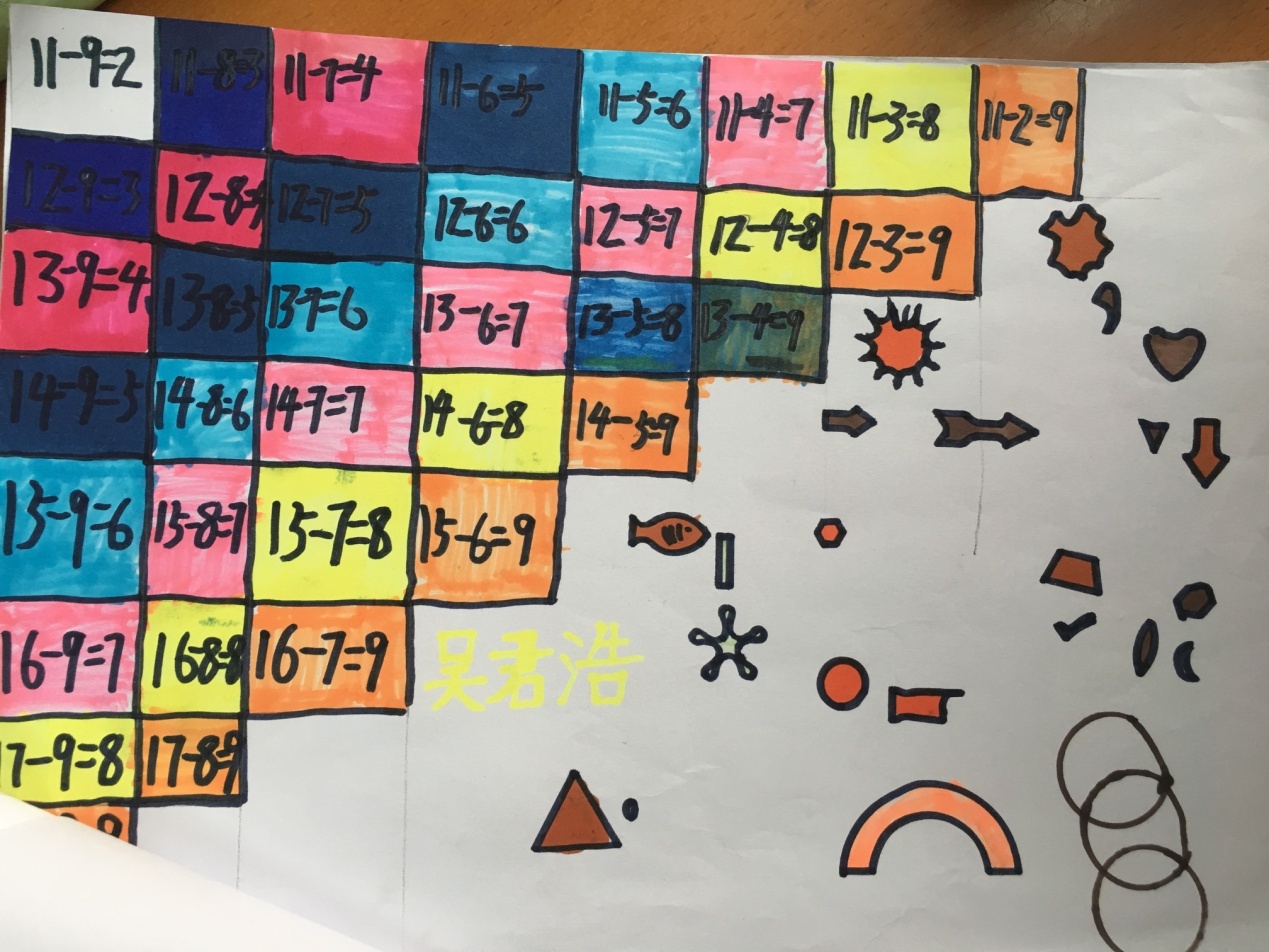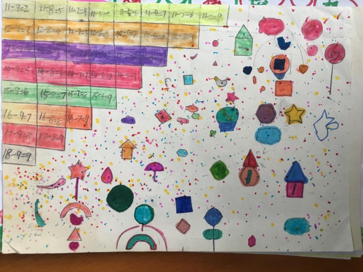 胡金梅5月份一年级数学特色评价 评价对象:一(3)(4)班学生 方案执行:胡金梅 一、活动宗旨 100以内的加减法口算,主要是两位数加、减一位数和整十数。这些口算在日常生活中有着广泛的应用,又是进一步学习计算的基础,因此,应该让学生比较熟悉地掌握。 二、活动内容 为学生提供大量的学习活动,通过前期浸润式感知,为课中集中、精致的学习储备大量的生活经验和活动体验。以实现深度理解口算算理和算法,夯实基础,落实教学目标。5月份的长作业安排了四个活动,分四个星期完成,第一星期:制作退位减法表,第二星期:图示表征口算过程,第三星期:计数器演示连加和连减,第四星期:口算大比拼。 三、活动推进 第一阶段项目:制作退位减法表 复习巩固20以内退位减法,制作一张属于自己的退位减法表,并用不同的颜色表示自己发现的规律。