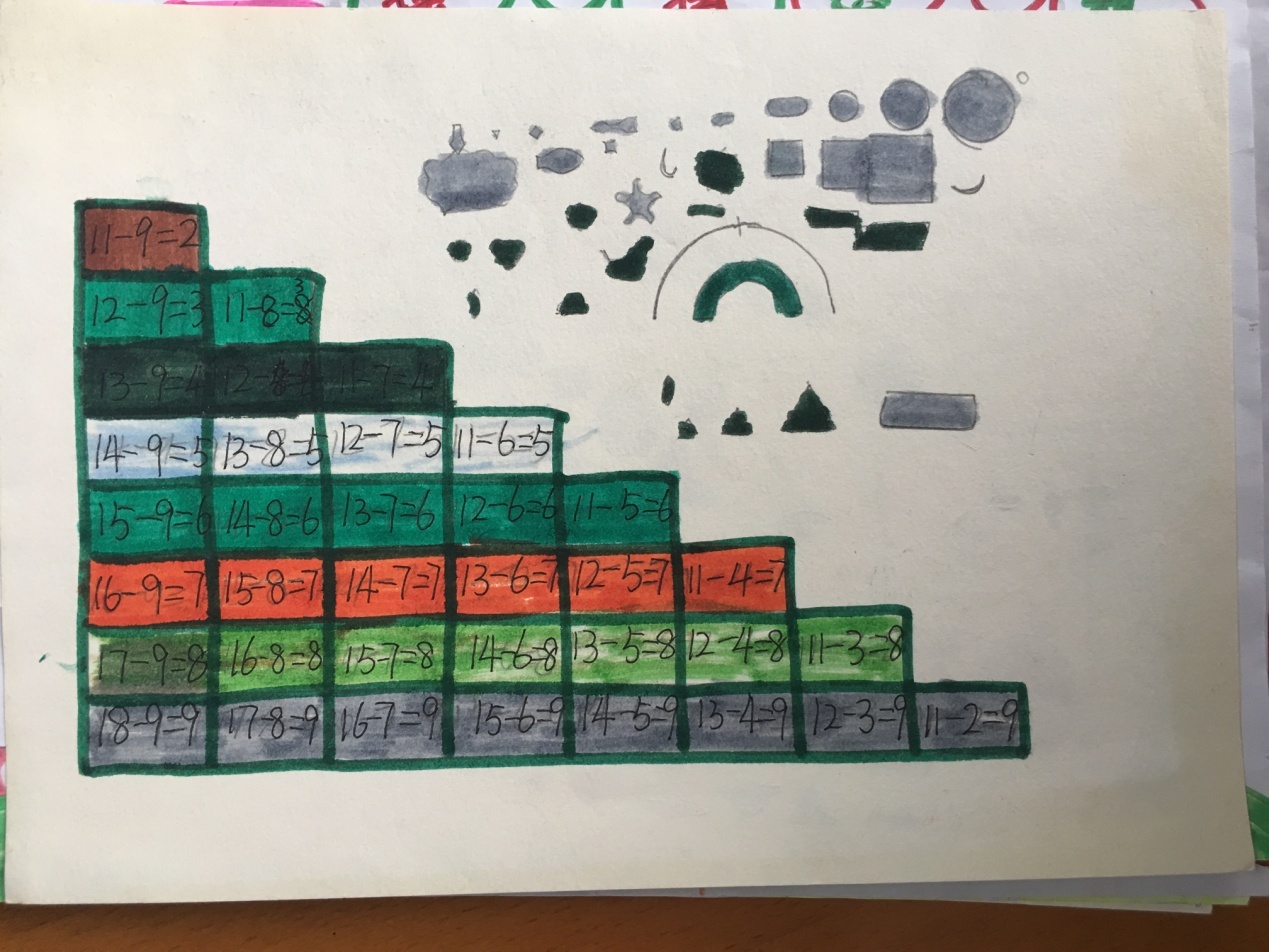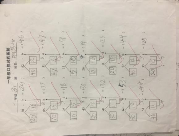 活动体会:通过制作退位减法表,寻找其中得数相同的算式,涂上相同的颜色,帮助学生发现规律:被减数和减数同时减少相同的数,差不变。也可以横着看,发现被减数不变,减数减少,差反而增加。竖着看时,减数不变,被减数减少,差也同时减少。 第二阶段项目:图示表征口算过程 本阶段的活动主题是:用图示表征口算过程,并口述思考过程。 学生作品展示: