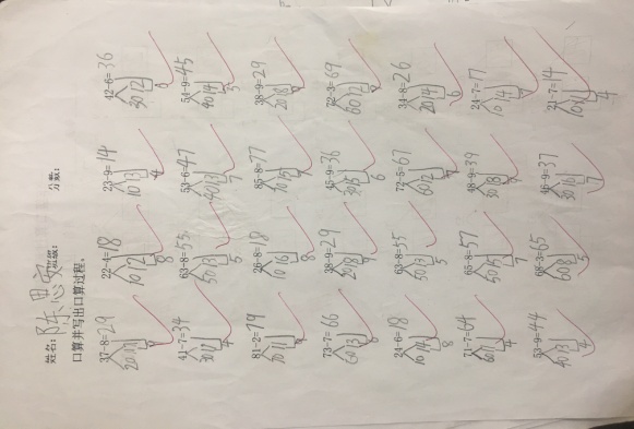 活动体会:在算式下面标注口算过程图,实际上是引导学生进行表象操作的过程,学生在头脑中重现分一分、摆一摆的过程,并用数学语言表征出来,从具体形象思维向抽象思维过渡的桥梁,在充分理解算理的基础上,学生进行抽象的符号操作,直接说出计算的过程。 第三阶段项目:口算大比拼 本阶段的活动主题是:口算大比拼 评价过程: