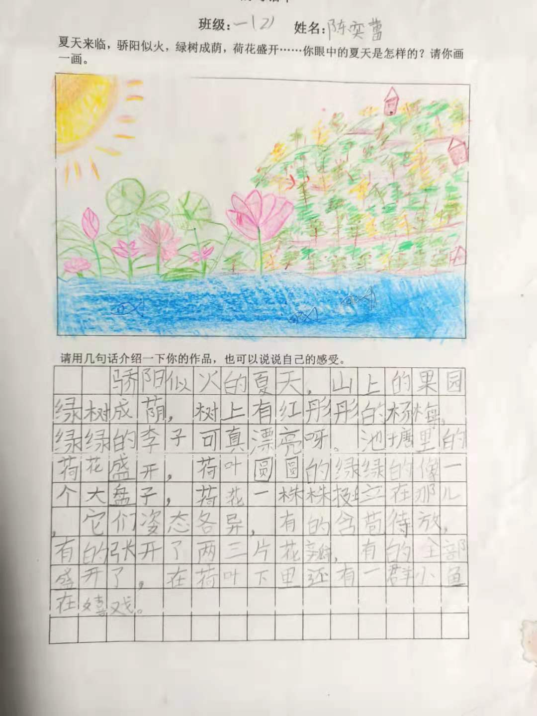 上交作业了, 孩子们一张张图文并茂的作业纸展现在我眼前,让我耳目一新,不胜欢喜,那里有盛开的荷花,飞舞的蜻蜓,金黄的沙滩,爽口的冰激凌,快乐的小朋友……
