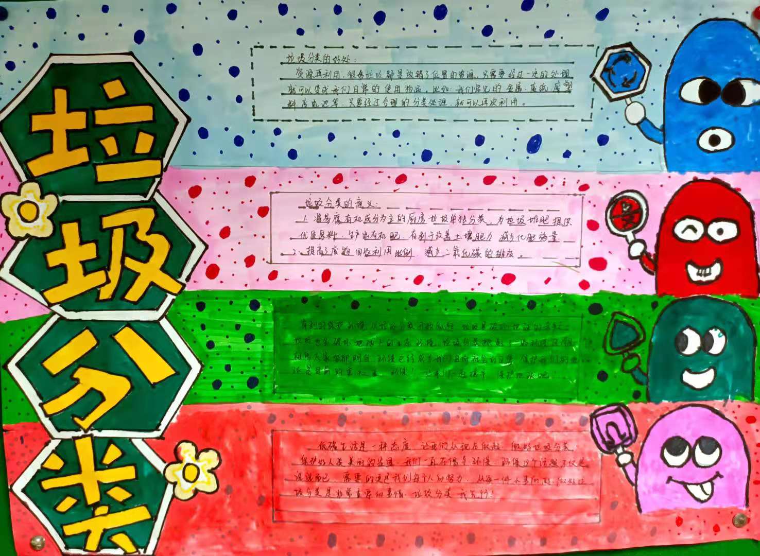 古诗是我国古典文化的精华,小学生背诵、学习古诗,可以丰富语言积累,提高感悟能力,提高审美情趣,提高文学素养,使孩子终生受益,好处数不胜数。背诵古诗文经典是一种寓教于乐的活动,开展“古诗考级”活动,全班同学通过对诗、竞赛等各种形式,激发了大家的学习兴趣,增强了孩子的记忆力。 (二)“垃圾分类”手抄报、绘画比赛 为了将“无废文化”融入日常教育教学,不断增强学生的节约意识、环保意识、生态意识,培养生态道德和“无废文化”理念与行为习惯,推动形成简约适度、绿色低碳、文明健康的生活学习方式。我结合学校“无废校园创建系列教育活动”,在班级里进行里一次手抄报、绘画比赛,并将优秀作品展示在黑板报上。