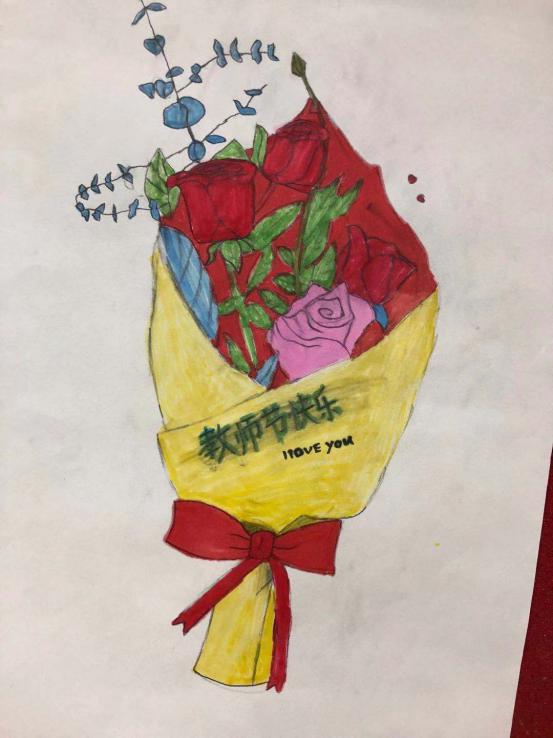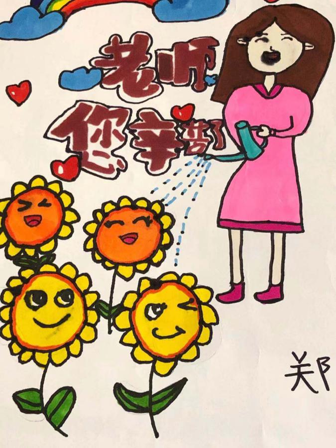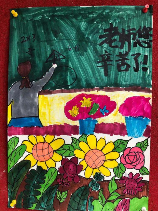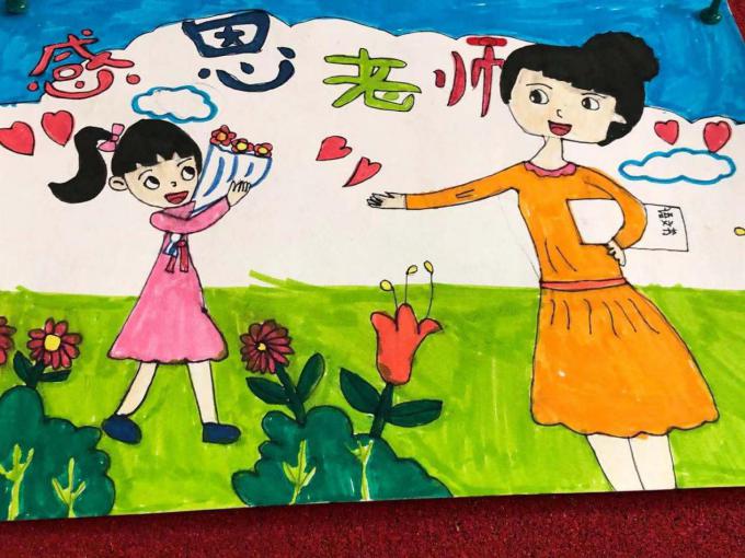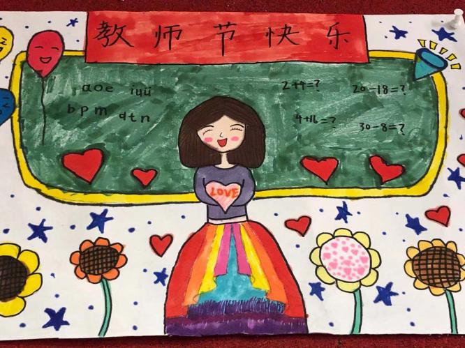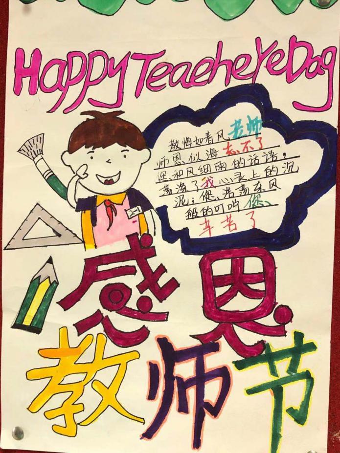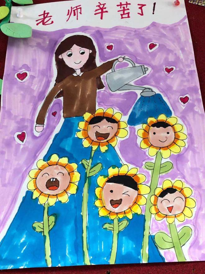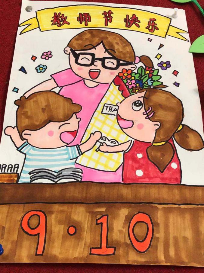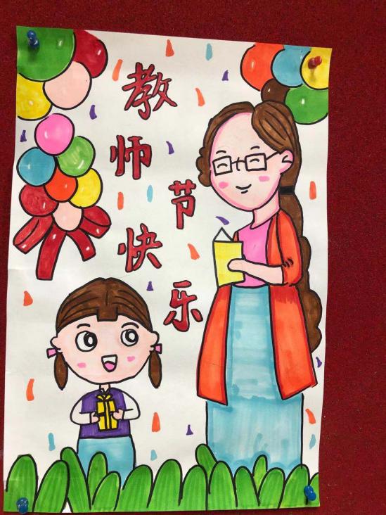 教师节绘画 活动目的: 在第37个教师节来临之际,我县各个学校班级群内“廉洁从教 绿色过节”的倡议书频频跳动,“绿色”新风吹遍校园。我自然而然地想到了让孩子们动手画一张祝老师节日快乐的图画,这样既锻炼了孩子的动手能力,又符合绿色教师节的理念。 活动过程: 1、微信跟家长说明本次活动的目的和意义。 2、学生构图,与家长配合准备绘画的材料。 3、画图画,写贺词。