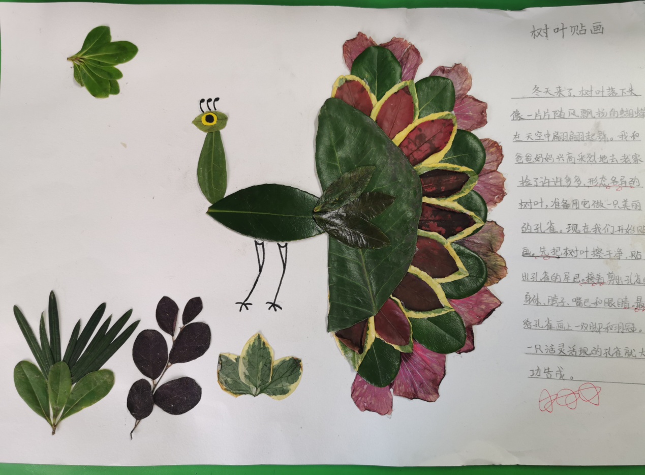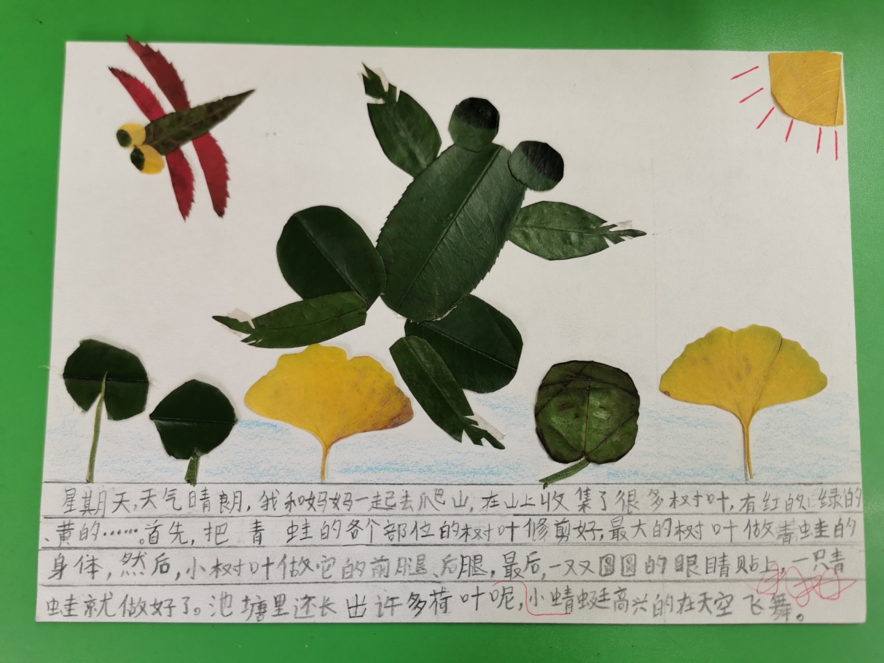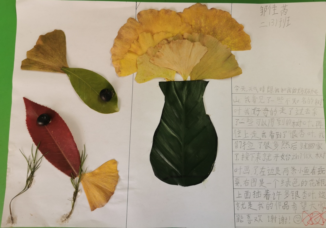 二年级(上)语文周瑞芳11月特色评价 二(3) 找秋天:树叶画 十一月的深秋是个多彩的季节,而且秋天的树叶颜色丰富,又是孩子们生活中处处可见的物体,它千姿百态,与很多物体的形状相同。寻找各种树叶来贴画各种物体既贴近大自然,帮助孩子们找到秋天,积累写话素材,又能贴近孩子生活激发孩子们的创造性思维,培养他们的设计制作能力。让我们一起和孩子走进大自然,体验树叶作画为我们带来的惊喜吧!