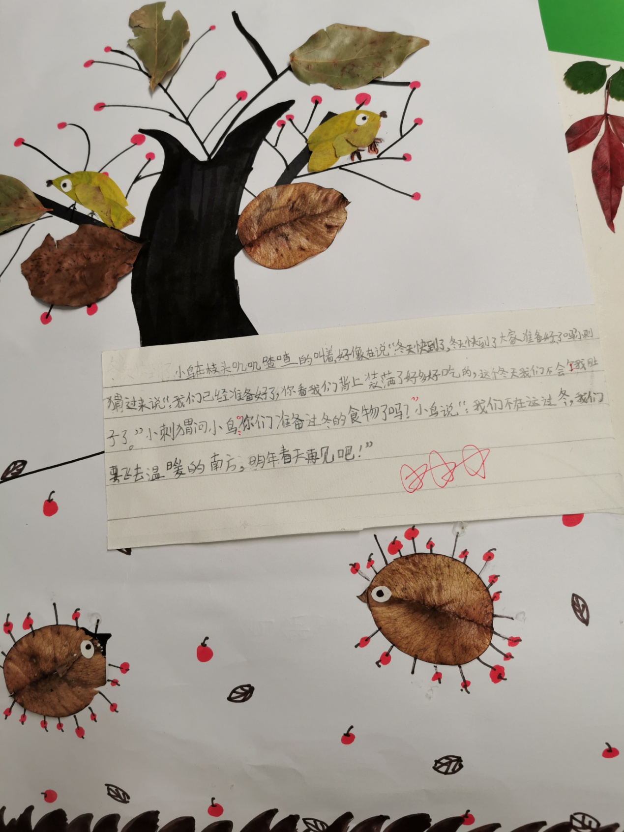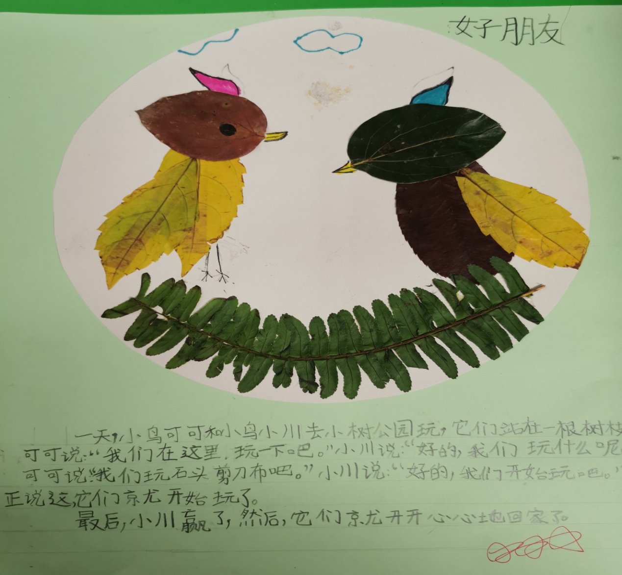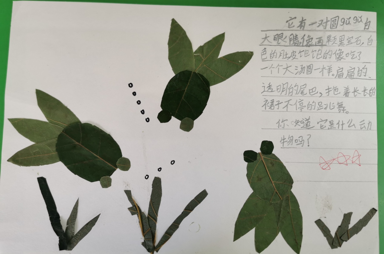 二年级(上)语文周瑞芳11月特色评价 二(3) 找秋天:树叶画 十一月的深秋是个多彩的季节,而且秋天的树叶颜色丰富,又是孩子们生活中处处可见的物体,它千姿百态,与很多物体的形状相同。寻找各种树叶来贴画各种物体既贴近大自然,帮助孩子们找到秋天,积累写话素材,又能贴近孩子生活激发孩子们的创造性思维,培养他们的设计制作能力。让我们一起和孩子走进大自然,体验树叶作画为我们带来的惊喜吧!
