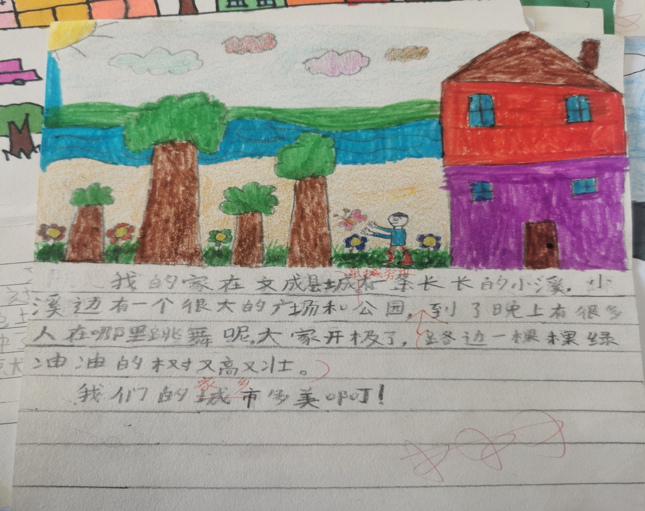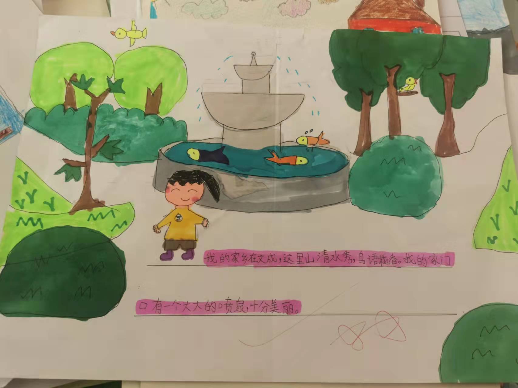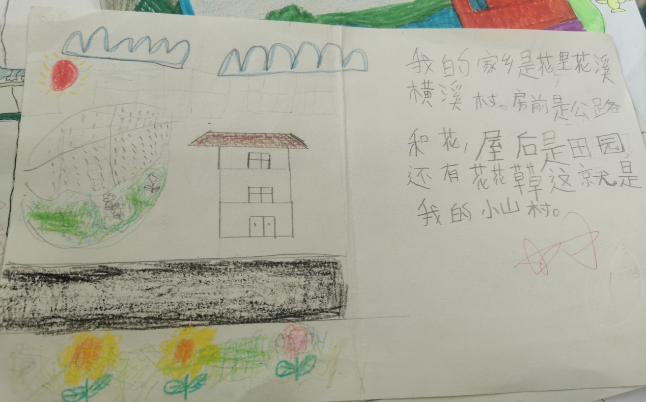 精美的树叶画引来了同学们的一声声赞美,有趣的故事更是赢得了老师们的称赞,夸我们是一位位想象力丰富小作家呢! 画(话)家乡 本月我班的特色评价之二就是根据学段实情,配合教材,在学习课文《画家乡》后,我对本班学生布置了“画家乡”的综合实践作业。孩子们兴趣盎然,斗志高涨,不仅画出了美丽的家乡,还话出了爱家乡的感情。 作品展示