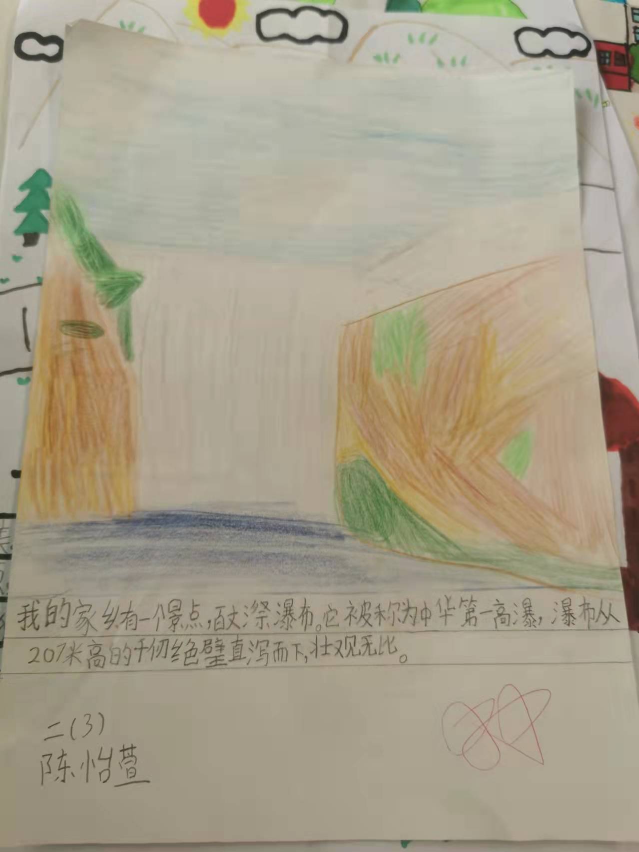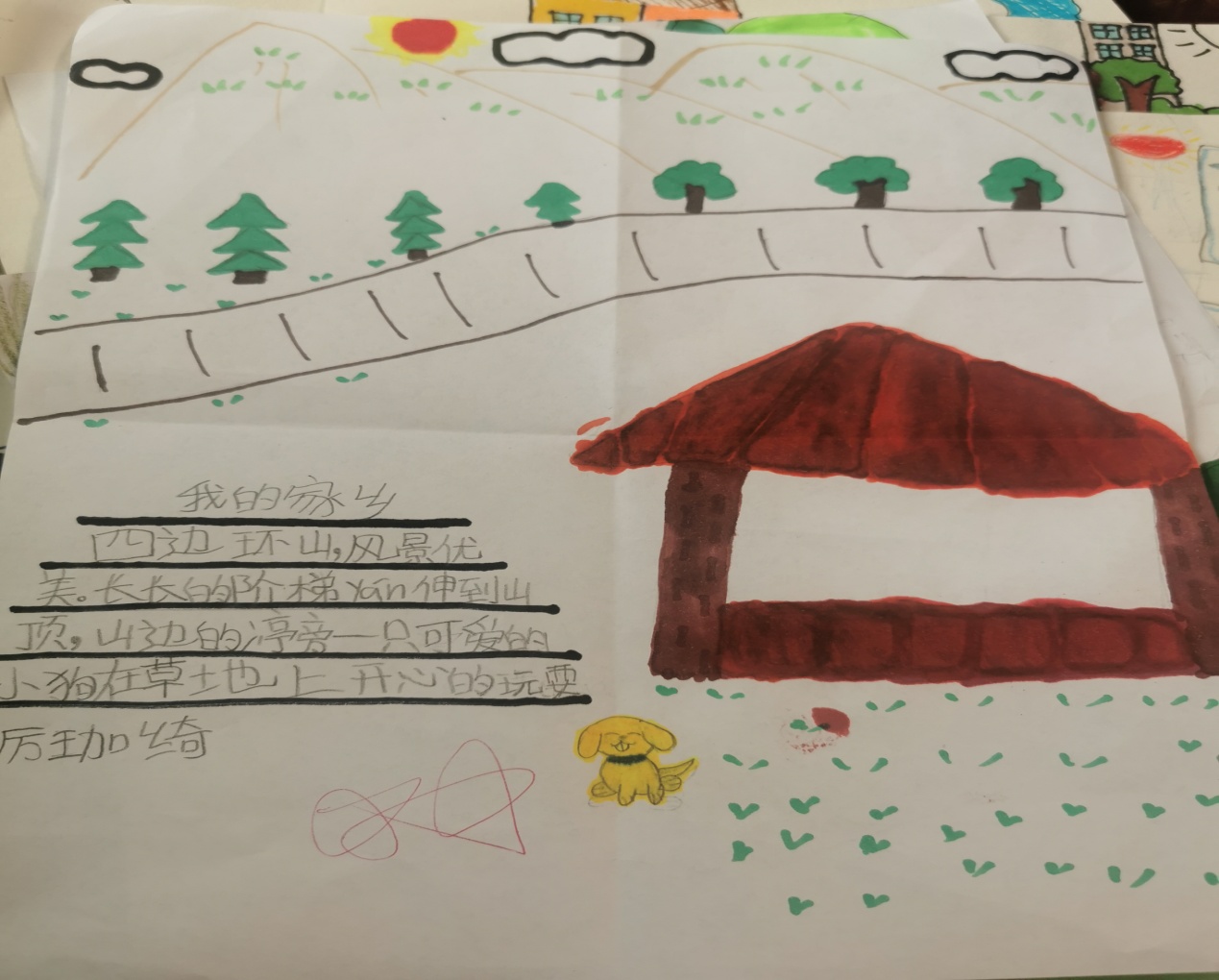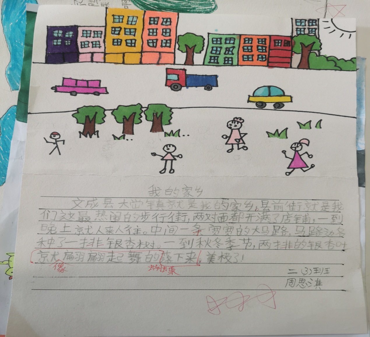 精美的树叶画引来了同学们的一声声赞美,有趣的故事更是赢得了老师们的称赞,夸我们是一位位想象力丰富小作家呢! 画(话)家乡 本月我班的特色评价之二就是根据学段实情,配合教材,在学习课文《画家乡》后,我对本班学生布置了“画家乡”的综合实践作业。孩子们兴趣盎然,斗志高涨,不仅画出了美丽的家乡,还话出了爱家乡的感情。 作品展示