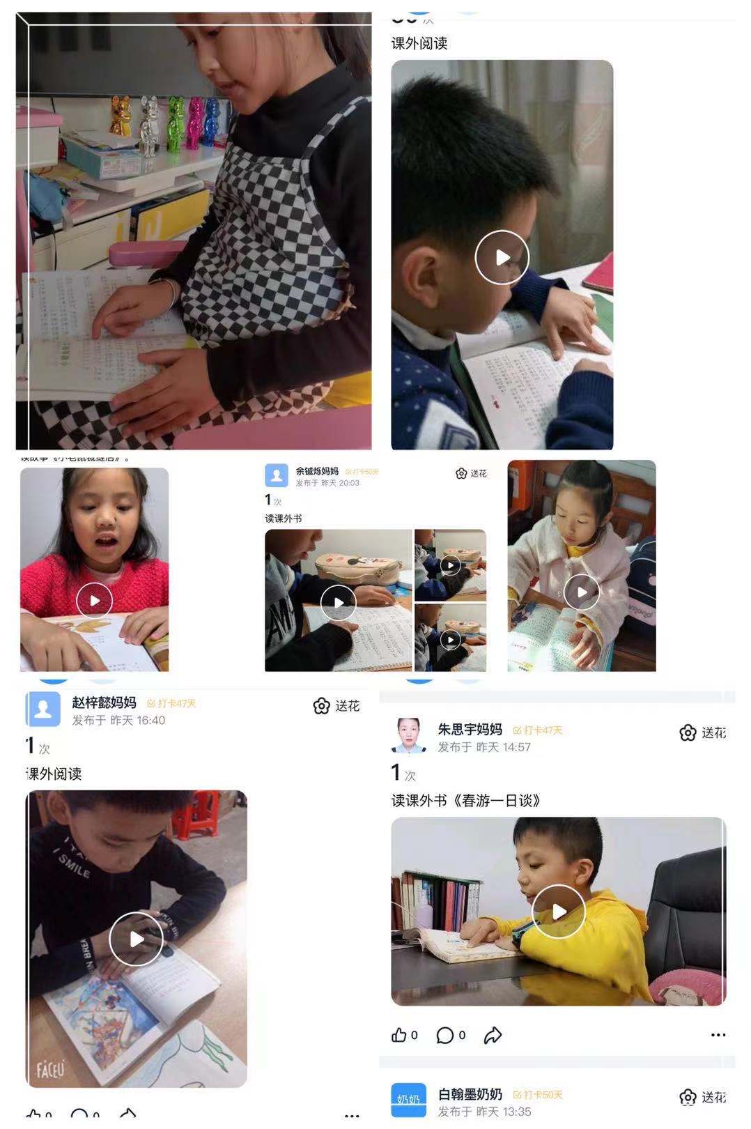 阅读背诵打卡 课外阅读是常态作业,每天阅读半小时,让孩子们在家里阅读,进行小黑板打卡,家长监督完成,老师及时进行发表评价,及时鼓励,孩子们你追我赶,气氛浓郁,背诵语文书中要求背诵的篇目。