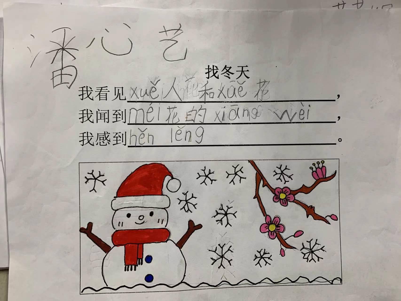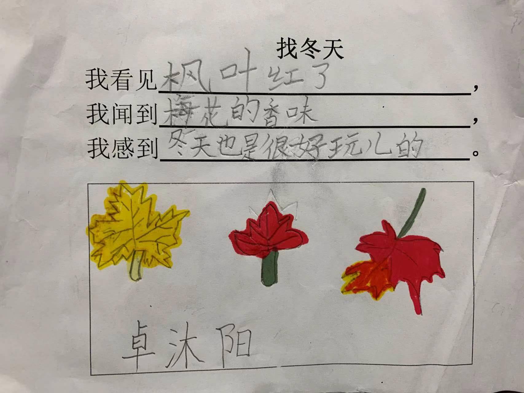 活动感想: 通过此次活动,增进了孩子与家长的亲子感情,培养了孩子的动手能力。孩子们在表演中才艺得到了展示,笑容在他们的脸上绽放,自信在心底洋溢,他们感受到了节日的喜庆,感受到了校园生活的幸福,体验到了童年的美好。 找冬天 一、评价目的: 1、通过看一看,闻一闻,摸一摸,吃一吃的方式感受冬天的到来,体验大自然的美好。 2、通过写一写,画一画的方式表达出自己找到的冬天。 二、评价内容: 1、和小朋友,和家人一起找冬天。 2、写一写,画一画冬天。 三、评价方法: 1、找冬天。 2、画冬天 活动剪影: