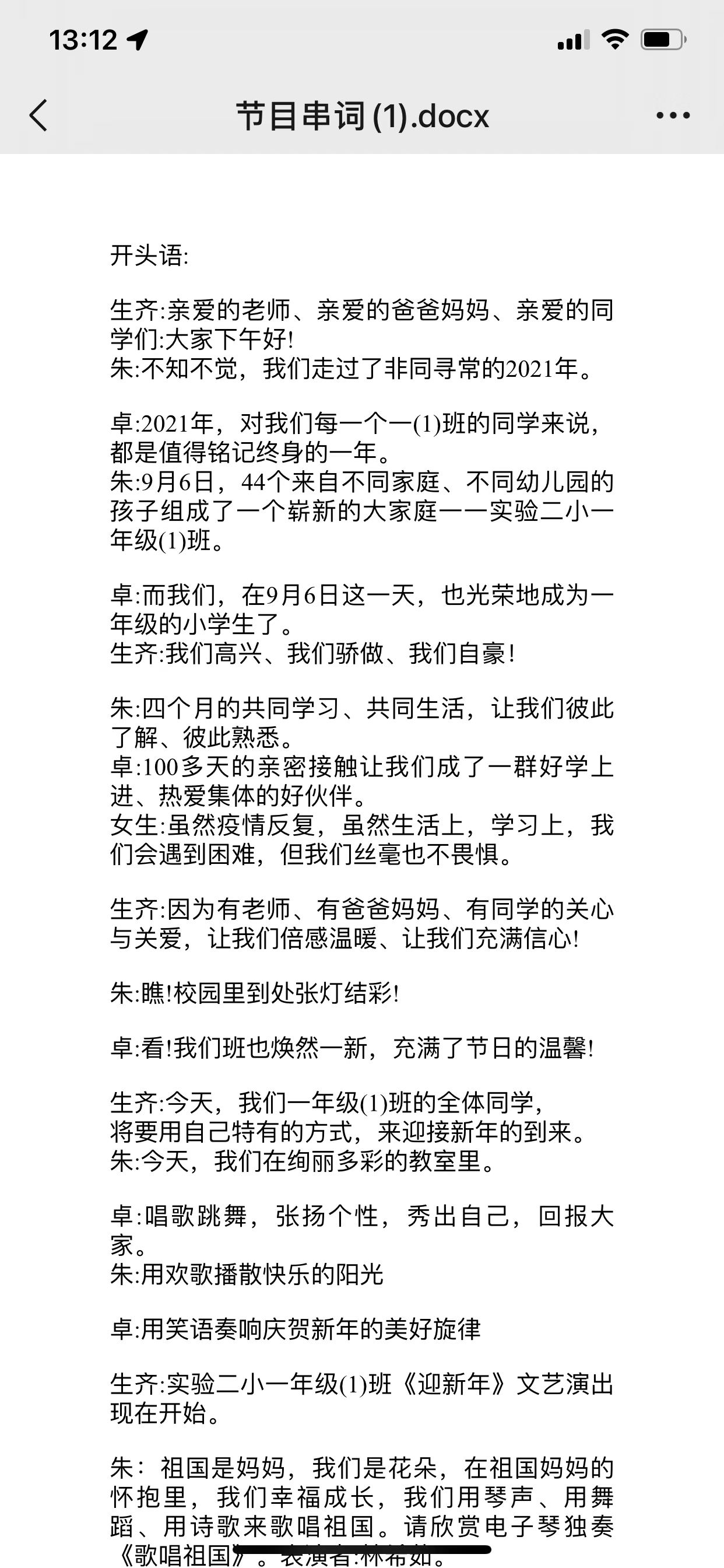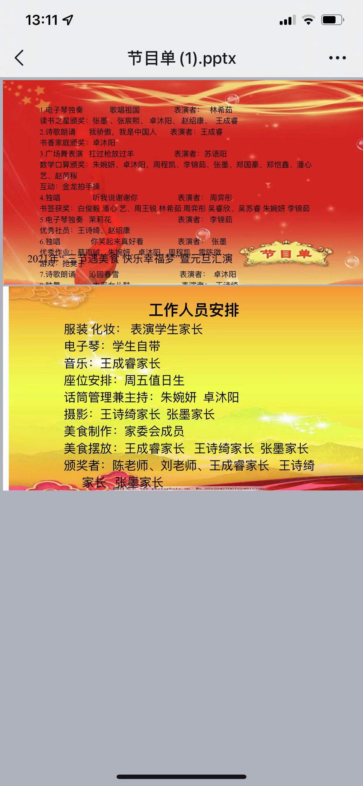 一年级(上)语文陈黄燕12月份特色评价 元旦遇美食 一、评价目的: 1、通过亲子动手装扮元旦环境,体会元旦的节日氛围,认识元旦的意义。 2、通过亲子制作美食,增强亲子情感。 3、通过节目表演,展现风采。 二、评价内容: 1、通过装扮教室,把对新年美好的愿望表达出来。 2、小朋友纷纷通过制作节目单,制定主持稿,表演节目,展现自己的才艺。 3、亲子制作美食,庆祝元旦快乐! 三、评价方法: 1、做一做美食。 2、写一写主持稿。 3、编一编节目单。 4、扮一扮教室。 活动过程剪影: