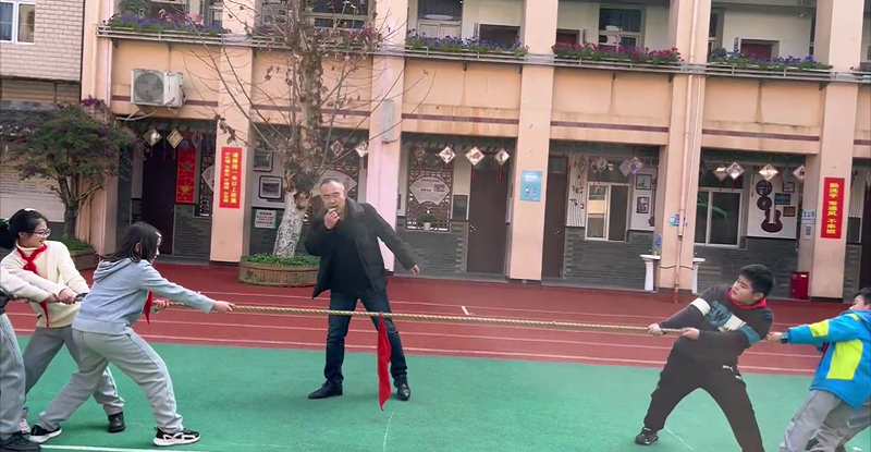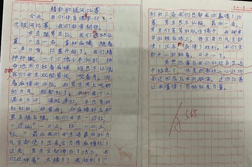 三年级(上)语文梁笑一12月特色评价 一次快乐的拔河比赛 活动背景 第八单元的习作话题是“那次玩得真高兴”,要求把一次玩的过程写下来,并表达出当时快乐的心情。这是本套教材第一次要求写事,写亲身经历的一件事的过程,使学生能不拘形式地写下真实的经历与感受。 为了把这次作文写好,和体育老师一起策划本次拔河比赛。让学生在亲身体验活动的快乐,使作文言之有物。 二、比赛方法 拔河绳中间系上一根红带子作为标志带,下面悬挂一重物垂直于中线。参 赛的两队人数相等,同时上场,队员左右依次交错分别站在拔河绳的两侧, 裁判员发出“预备”口令后,双方队员站好位置,拿起拔河绳,拉直做好准 备。此时标志带应垂直于中线。待裁判员鸣哨后,双方各自一齐用力拉绳, 把标志带拉过本队河界的队为胜方。 三、活动剪影
