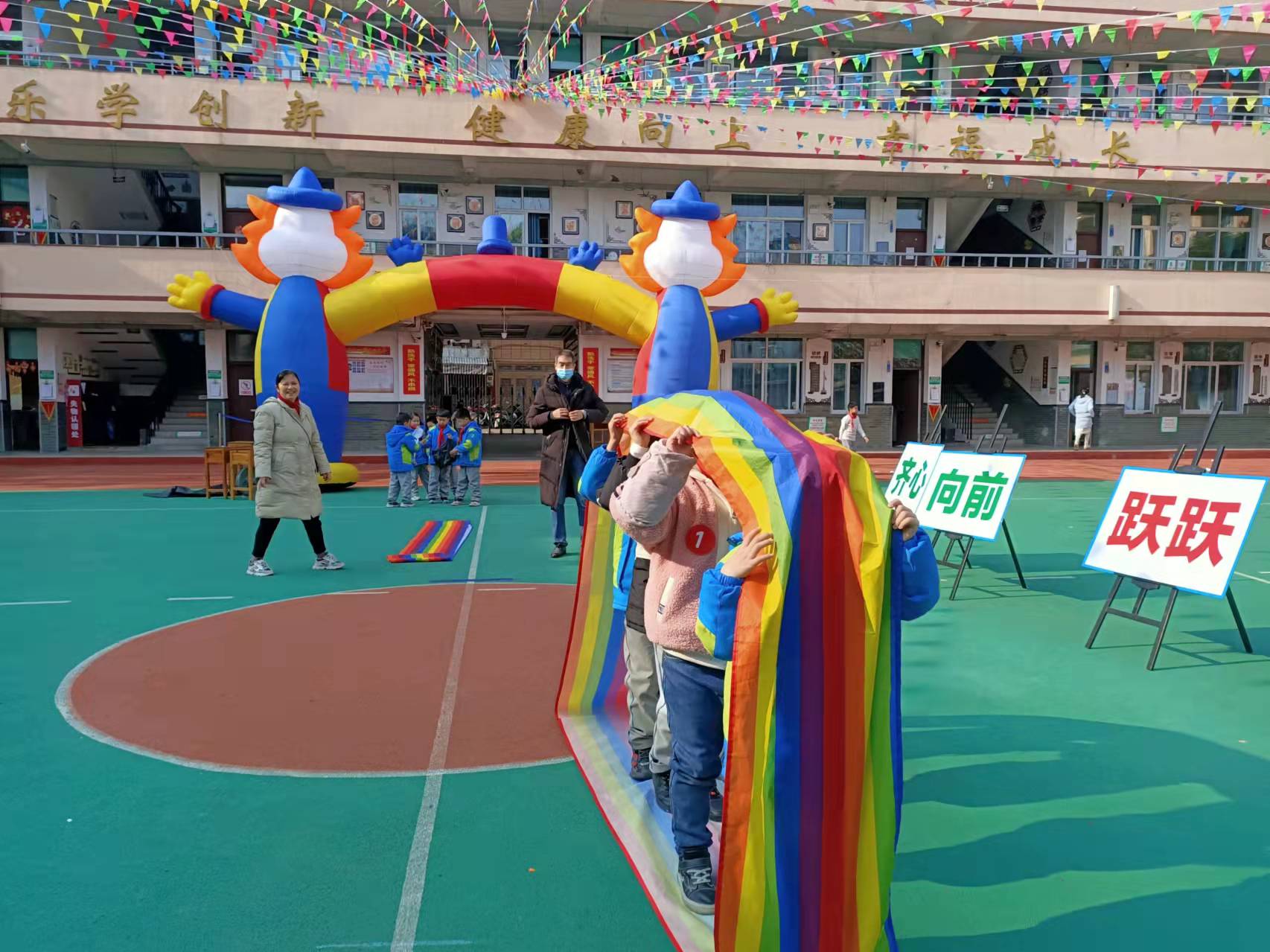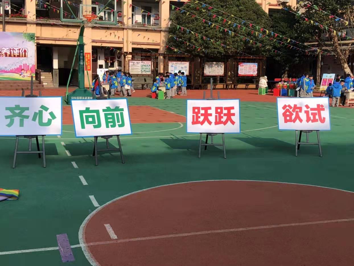 你瞧,别有新意、趣味十足的游考内容! 每个项目将语文、数学、科学、美术、体育、音乐等学科紧密地融合在一起,实现了文化科的四基考核与其他学科素养的融合评价,真正体现了多元评价让孩子快乐成长。 进场仪式更是别出心裁,你瞧,“齐心向前,跃跃欲试”, 孩子们四人一小组,手持彩带,齐心协力,小心翼翼地出发啦!这样的游戏开场,让人轻松愉悦,我想孩子们早就没有考试的紧张感了吧。 整个游考活动井然有序,每个孩子胸前都贴上了号码,大屏幕上还显示了呼号台,四个班级的孩子按照呼号台上的号码依次组团参加游考,有条不紊。老师们想得真周到呀!