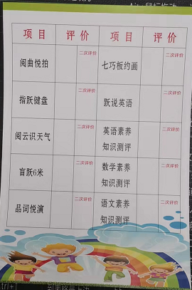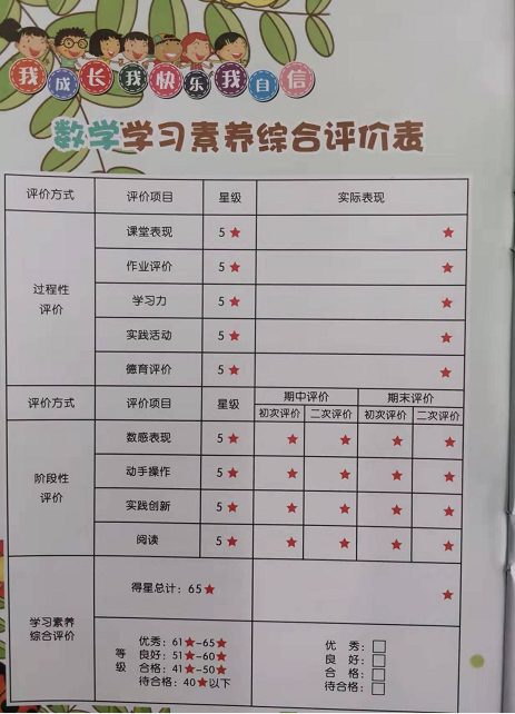 活动的目的与意义: 1.寓教于乐。通过新颖有趣的盲走6米活动,考查学生对时间和距离的感觉,让孩子在游戏中检查自己近期的学习状态查漏补缺。 2.加强家校合作。设立家长考官和学生考官,让家长也参与其中,加强家校联系。轻松愉快的活动也让孩子对学习产生兴趣,让学生变得爱学好学。 看,我们的评价卡: