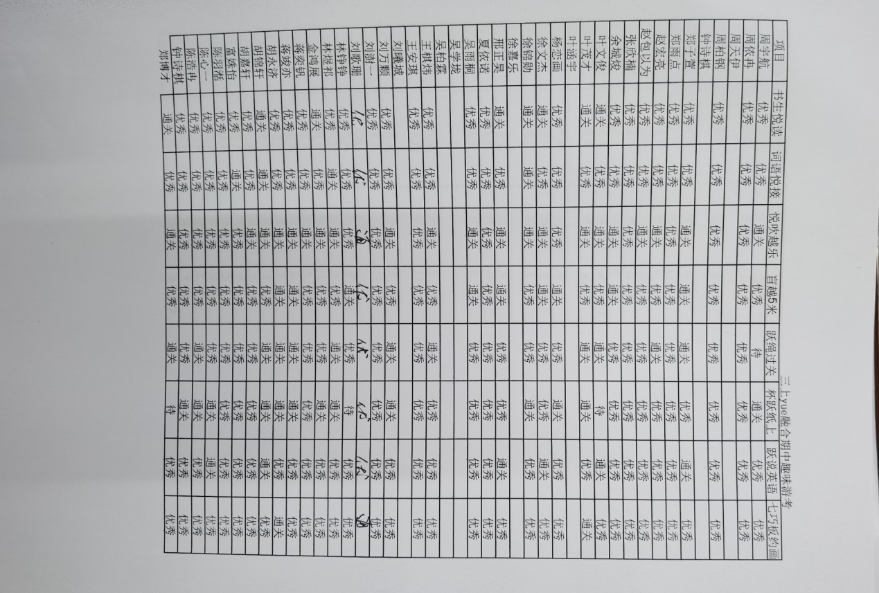 三、游考分析总结 通过游考后的采访,学生对“盲越5米”、“跃说英语”、“七巧板约画”、“杯跃纸上”等项目比较喜欢。学生比较喜欢新鲜的、好玩的、有一定挑战的项目。在“盲越5米”的项目中,有些学生成绩不够理想,进一步采访发现孩子回去没有去认真尝试,只是想当然地认为自己会了。 以后的游考可以按综合性、游戏性、实践性方向发展是完全可以的,让孩子学有所用,学有所展示。同时,要督促孩子怎样完成挑战。