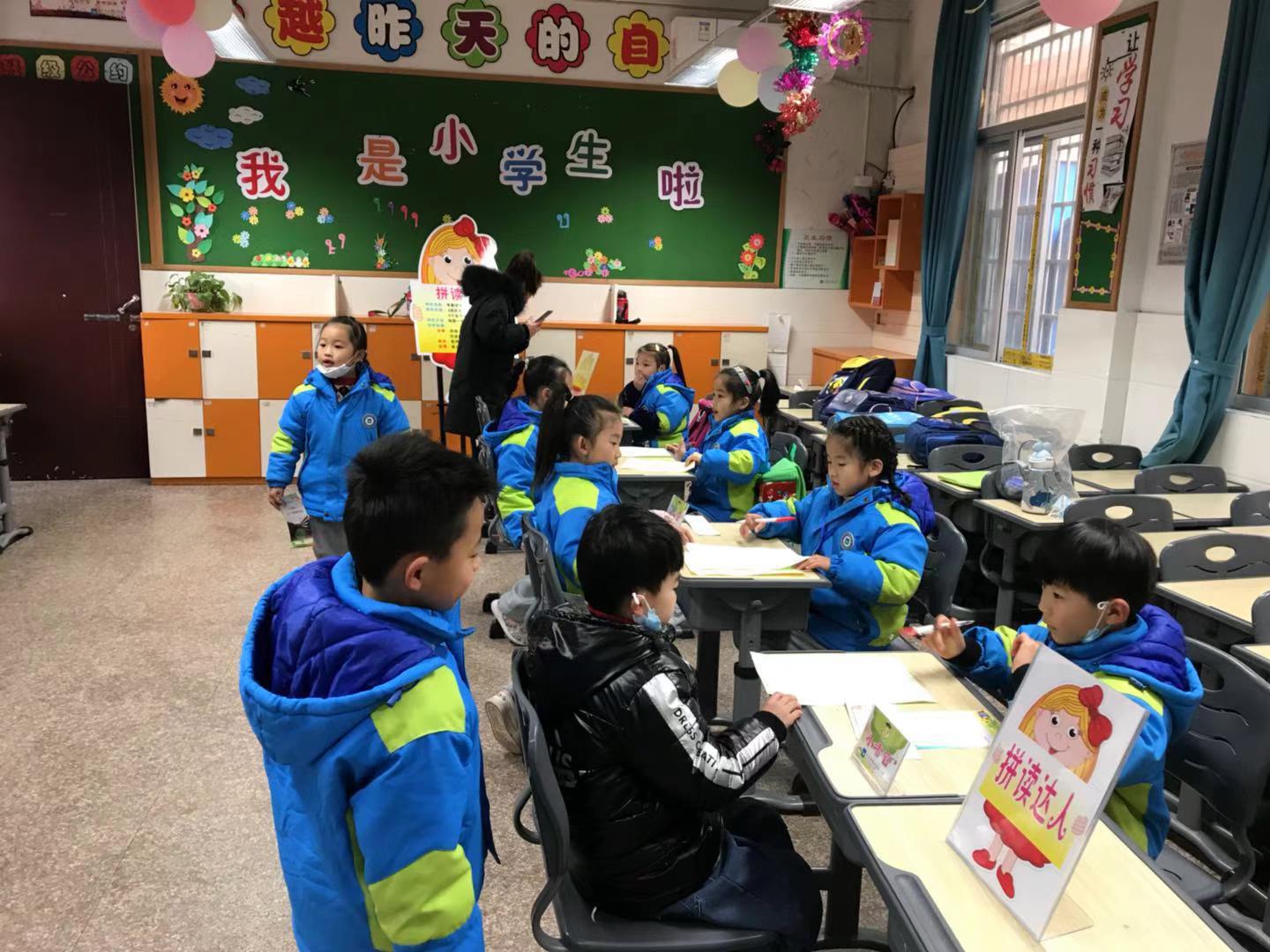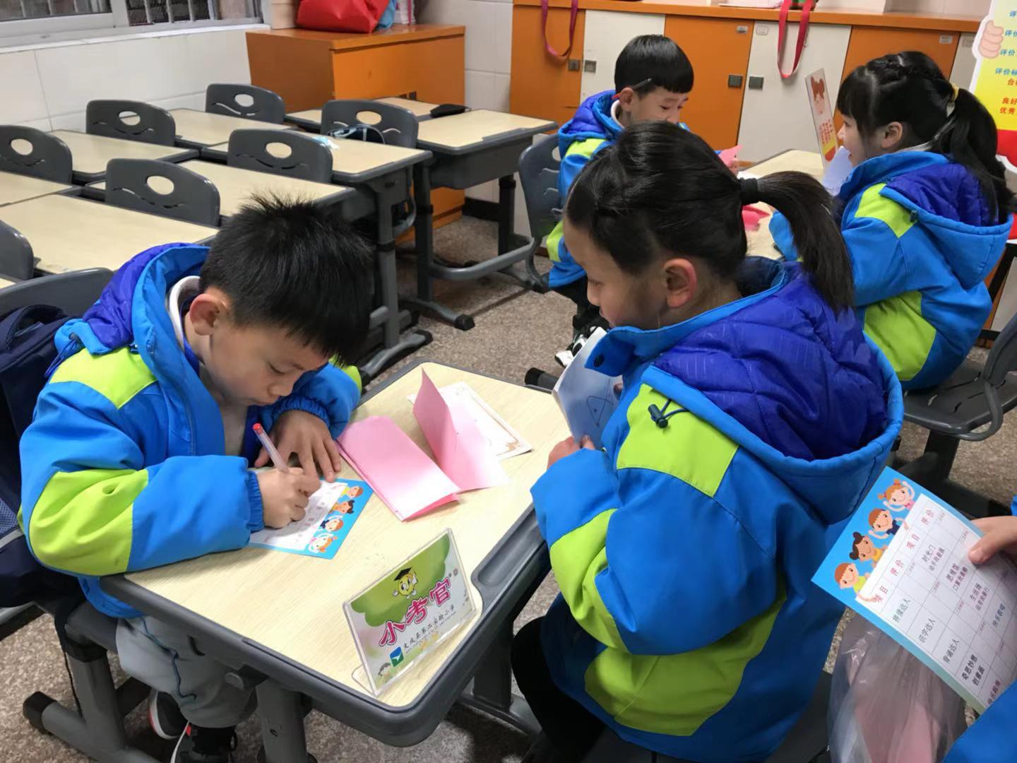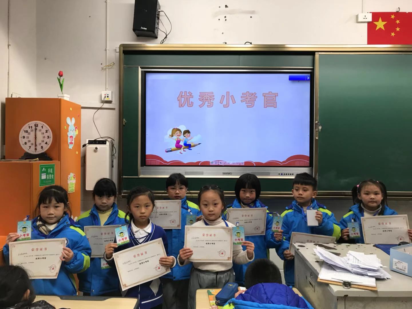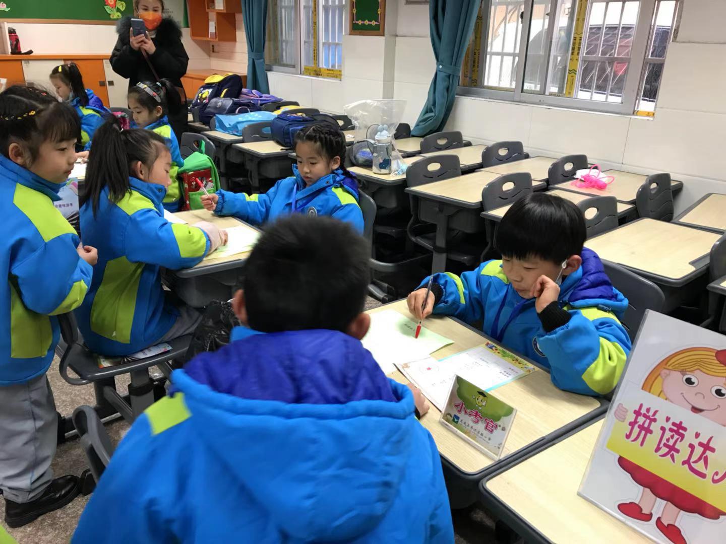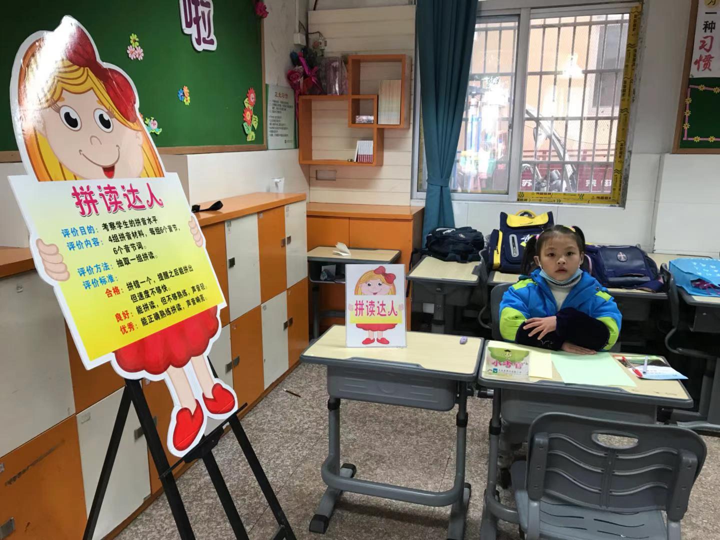 一(4)第一学期期末评价 刘余珍 为了有效地落实“双减”政策,营造轻松的学习氛围,2022年1月13日,我们一年级举行了游考,学校依据课程标准,制定测试内容,让检测与考核融入到游戏之中,用游戏取代纸笔考试,让孩子们在快乐的游戏中学习知识,检验成果。此次游考,我们语文的评价内容有 “拼读达人、识字达人、背诵达人”等三项内容。现场测试老师根据学生的表现,以优秀、良好、合格的方式进行现场评价。 在趣味游考前,首先要介绍一下我们的优秀小考官!他们能细致耐心地听考生们答题,做到公平公正的评分,俨然是一位位小大人的模样!