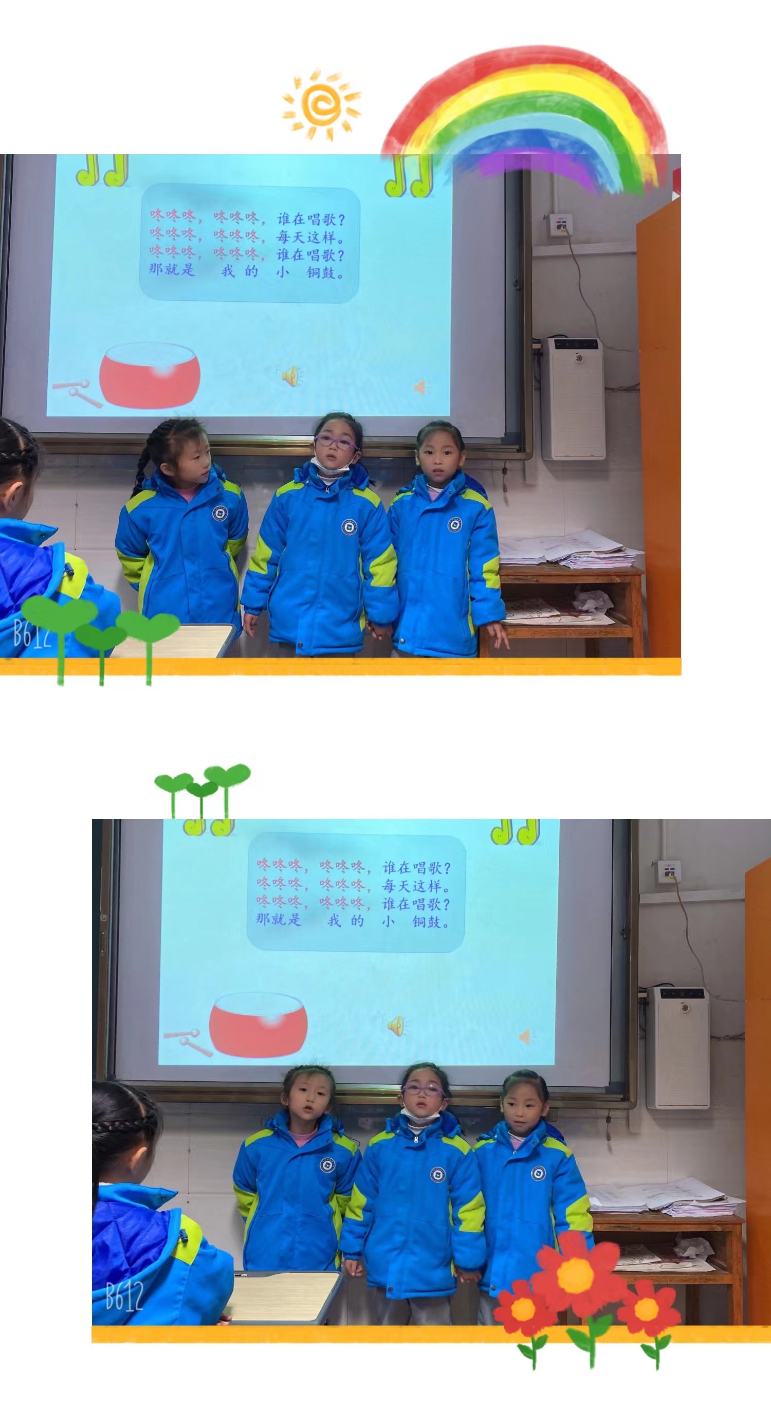 “X”的评价过程: “小组编创歌曲” “咚咚咚,咚咚咚,谁在唱歌 咚咚咚,咚咚咚,每天这样 咚咚咚,咚咚咚,谁在唱歌 那就是 我的 小 铜鼓”你们听一(2)班季一诺小组编得乐器之歌《小铜鼓》可真美妙!