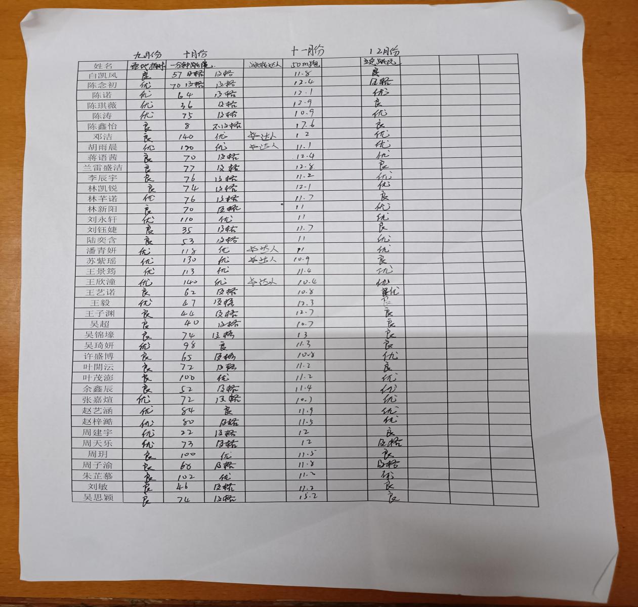 一年级12月份立定跳远测试评价 郑文杰 一、测试目的 立定跳远是测试下肢爆发力和全身协调能力。 二、场地器材 地面平坦,一块立定跳远垫子。 三、测试方法 不要踩线,否则成绩无效。运动员从起跳线到跳起落地后距离起跳线最近脚的后脚跟的距离为跳远成绩。脚落地之后身体倾倒成绩是无效。每人三次机会。取成绩最好的一次登记成绩。 四、测试标准: 男生 女生 优秀: 1.3米以上 1.2米以上 良好: 1.2米—1.29米 1.1米—1.19米 及格: 1.0米—1.19米 0.9米—1.09米 不及格:>0.9米 >0.9米 五、测试结果: 一(3)班共有41人,其中优秀21人,良好17人,及格3人,不及格0人。 六、整改的措施 1、向课堂40分钟要质量,认真钻研教材,认真备课。 2、平时的教学中,通过组织比赛来激发学生的学习兴趣,多进行提高学生爆发力和腿部力量的训练。 3、把这一项重点落实到女生的整体练习和提高上。 4、加强后进生的培养和练习上,多把注意力放在这部分学生的在练习时的强度和到位上,逐一排除后进生。