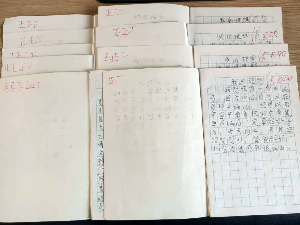 同样,每次批改后,在写话本的第一页用“正”的形式,对所得的星数进行统计,满10颗星可加1分阳光值,以激励学生的积极性。