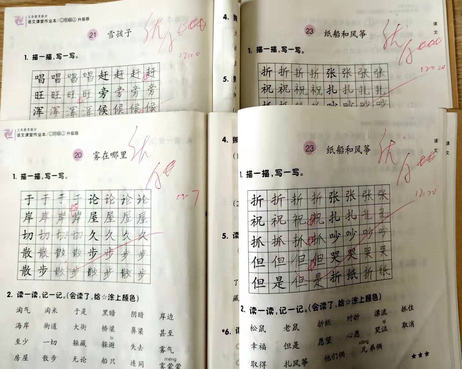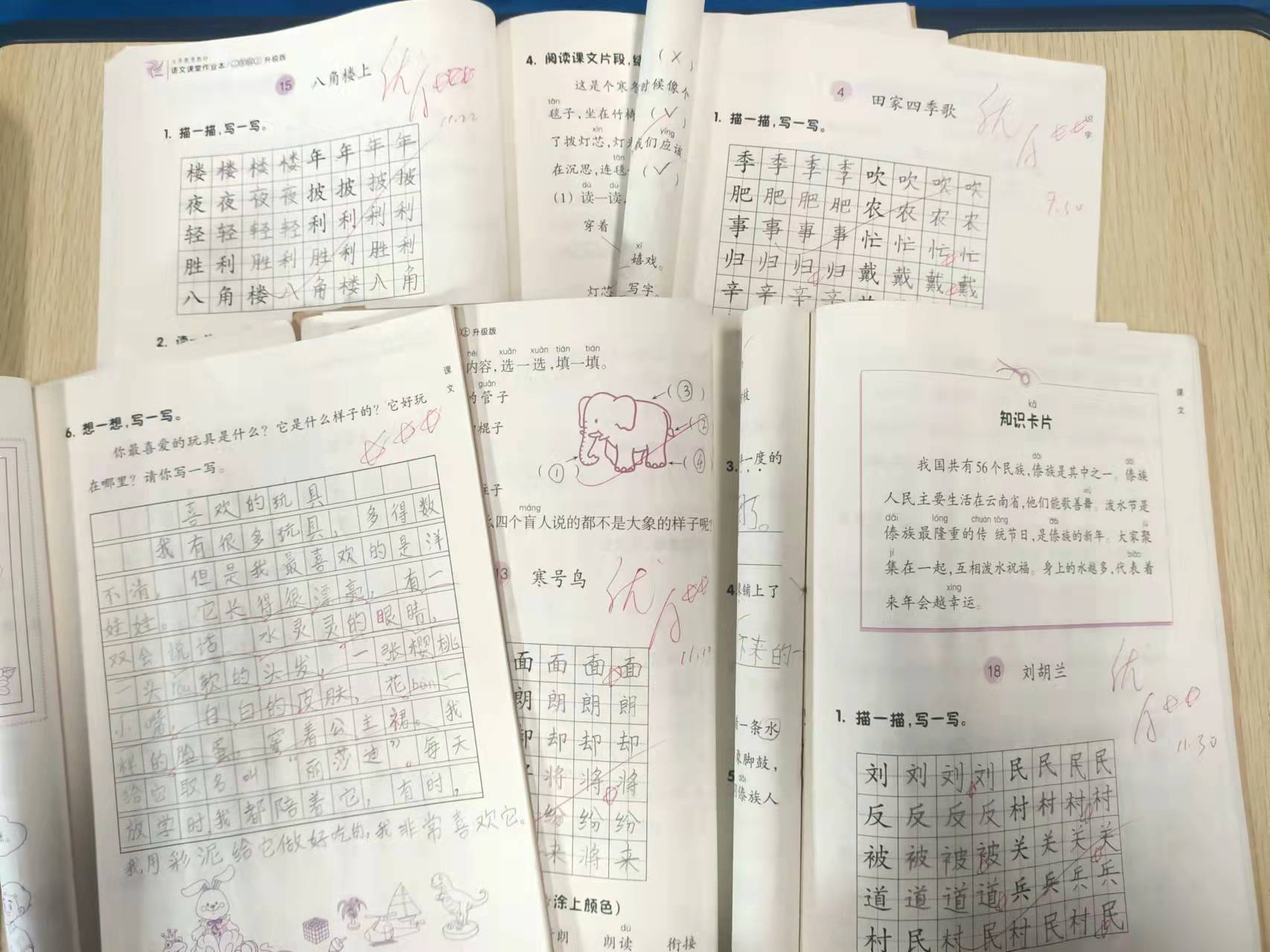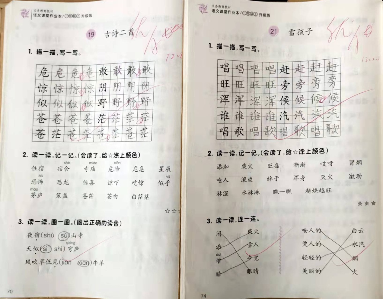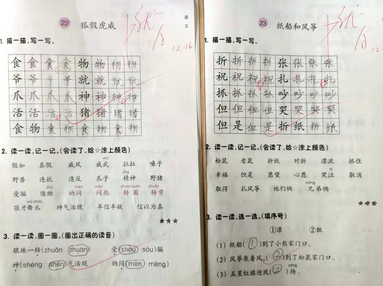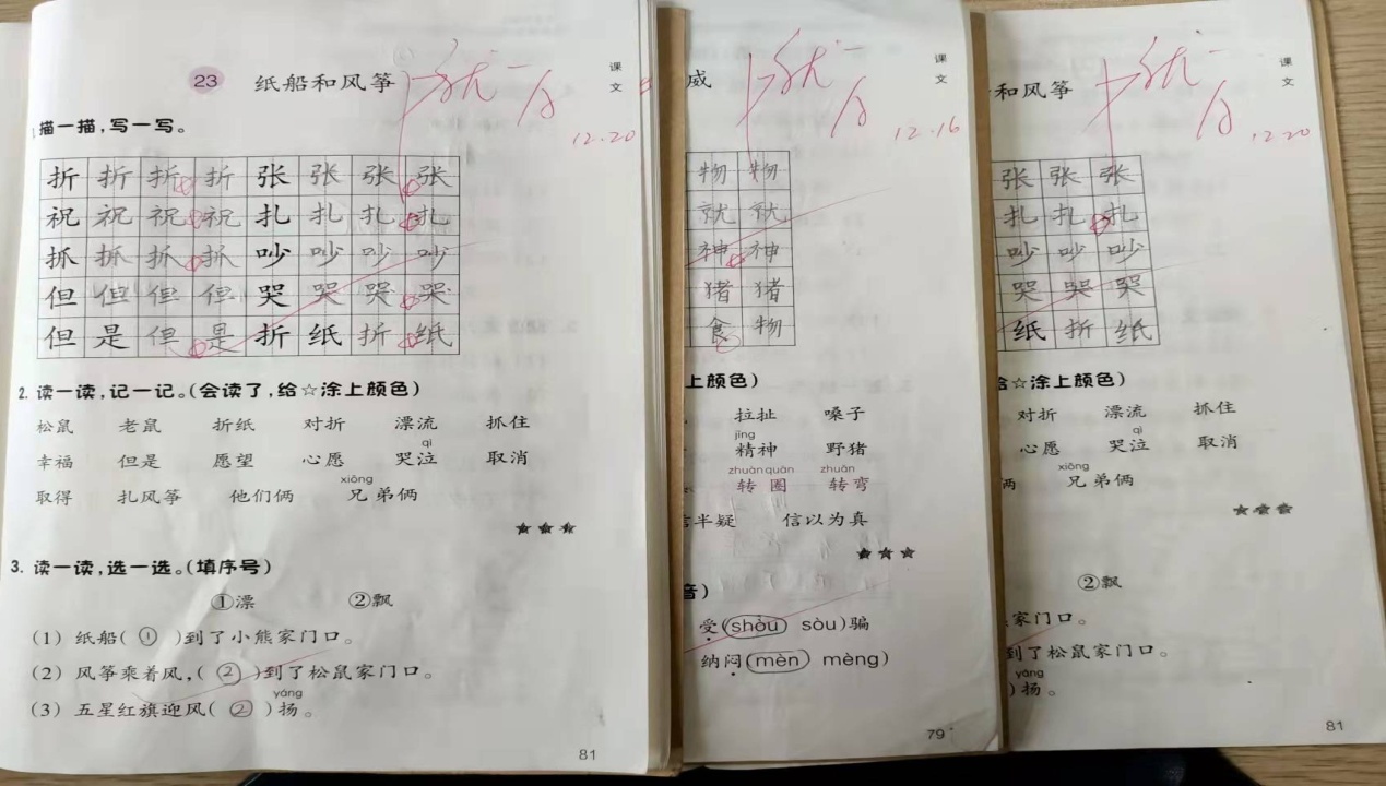 12月份的教学任务是第七、八单元。学期已接近尾声,我在改进前面三个月的作业基础上,继续进行课堂作业本、抄写、听写、词语过关、背诵、写话等作业的布置与批改。对学生的“1”评价仍然是《课堂作业本》。学生的《课堂作业本》要求在课内完成,采用面批或收上来再批的形式。批改的时候,首先采用等级制对学生的正确率进行评价,用优、良、中三个等级来区分,然后,采用A、B、C加五角星的形式对学生的卷面进行评价,A加三星为最棒,再根据字迹的工整度和作业的清晰度进行逐级降星。个别书写端正美观的字,可以另外加五角星。