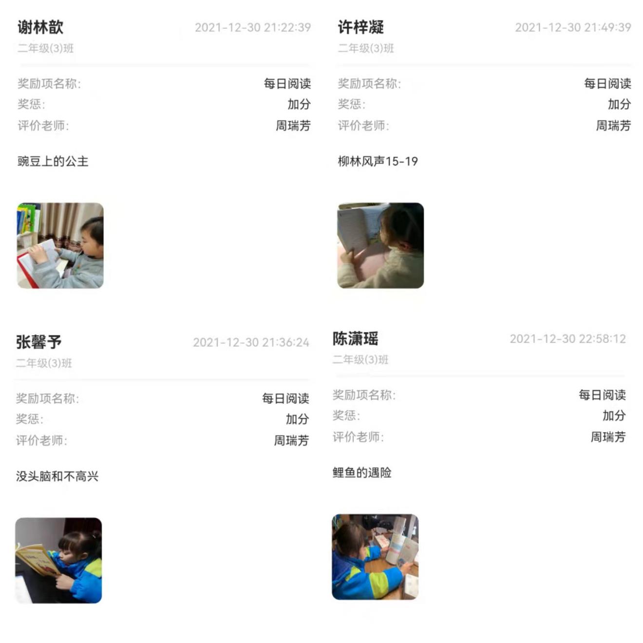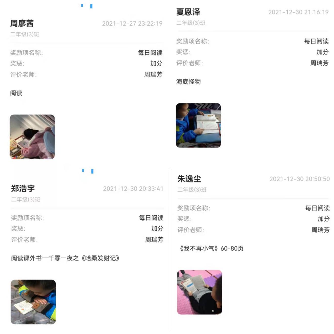 X评价(二、课外阅读) 学习语文这门课,离不开多读、多背、多记,养成读书的习惯非常重要。为了培养学生良好的读书习惯,我利用师生通,家校合一,监督孩子们每日阅读,形成习惯。