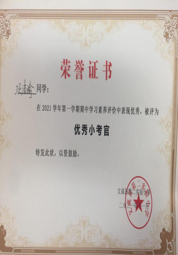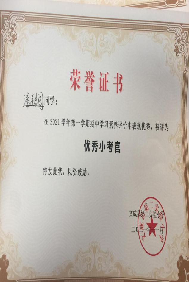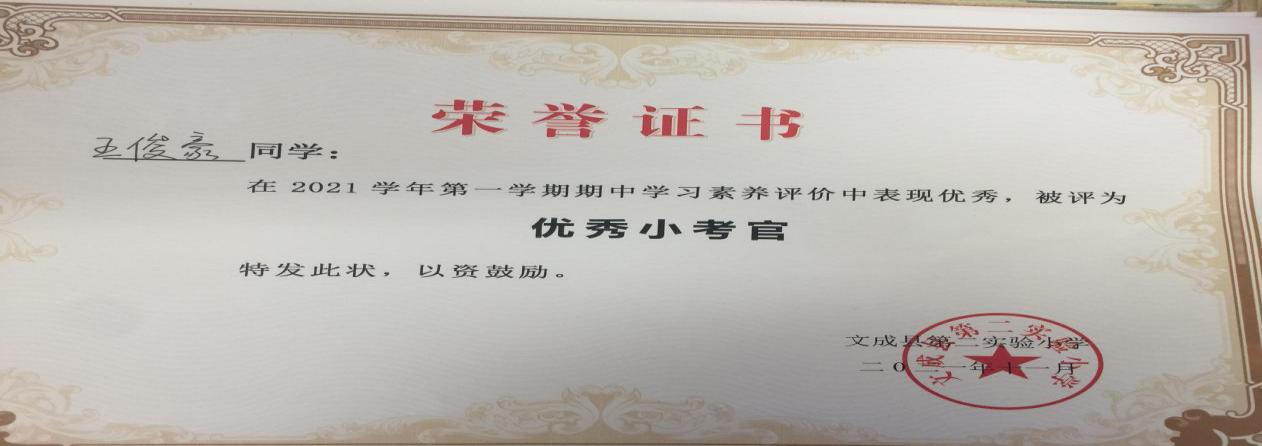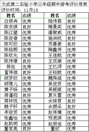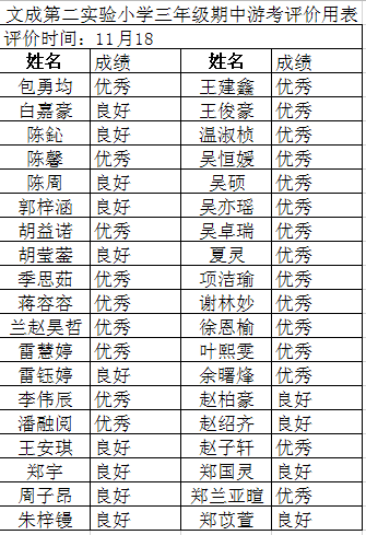 三上数学三(3)三(4)期中乐考总结 秋风扫落叶,初冬寄寒声。尽管气温急转剧下,但是校园内却热闹非凡。在老师们的精心准备下,在孩子们的满心期待下,11月18日下午,金色的阳光洒在实验二小那黄绿相间的塑胶操场上,显得格外美丽。一排排整齐的椅子摆放在操场正中央,孩子们穿着蓝色的冬季校服,聚精会神地盯着大屏幕,正耐心地等待着大屏幕上显示的测试序号,生怕错过了游考的时间。 活动的目的与意义: 1.寓教于乐。通过新颖有趣的盲走五米活动,考查学生对时间和距离的感觉,让孩子在游戏中检查自己近期的学习状态查漏补缺。 2.加强家校合作。设立家长考官和学生考官,让家长也参与其中,加强家校联系。轻松愉快的活动也让孩子对学习产生兴趣,让学生变得爱学好学。 看,我们的评价卡: