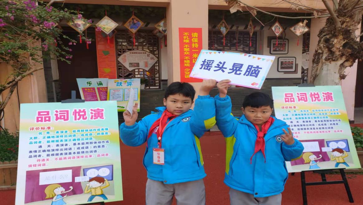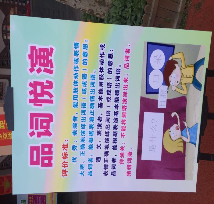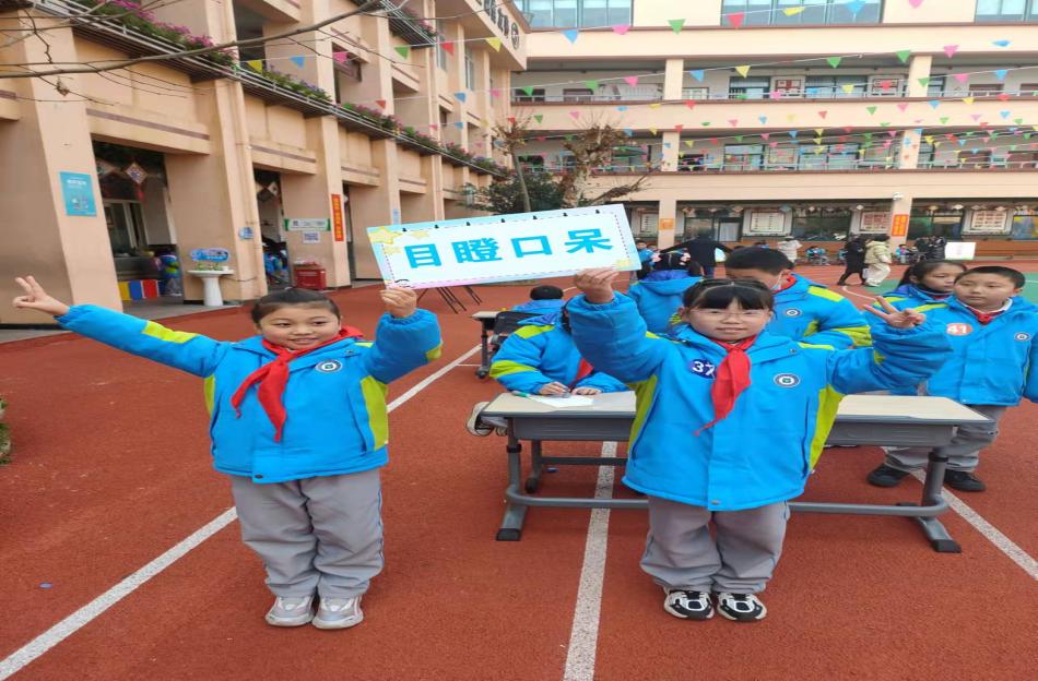 2022年1月13日,是一个令人难忘的日子。孩子们集中在学校的操场,兴奋又激动,那是他们又迎来了期末游考。本次期末评价,实验二小三年级采用学科“yue融合”的趣味游考形式, 具有趣味性、合作性、创新性、挑战性、实践性的特点,真正体现了多元评价让孩子快乐成长。语文评价的目标紧扣本册语文要素中的理解词义,检测孩子们在语文学习中的积累、理解、演绎和想象能力。体现评价的趣味性与个性化。二、评价的内容品词悦演三、评价的方法品词悦演——语文词语理解+个性展示①测试方法: 两人小组合作,商量分工,确定谁是表演者,谁是品词者。 表演者在考官处抽取测试的词条,看清内容后随即反面放在桌子上,不许给品词者看到。 表演者根据词条内容,展开想象,用肢体动作或表情大胆演绎词语(或成语)的意思;品词者仔细观看,根据表演内容,猜出词语。 完成后,揭开答案,两人举牌祝贺。 ②评价标准: 优秀:表演者,能用肢体动作或表情大胆、正确地演绎出词语(或成语)的意思;品词者,能根据表演正确猜出词语。 通关:表演者,基本能用肢体动作或表情正确地演绎出词语(或成语)的意思;品词者,能根据表演基本能猜出词语。 待努力:不能将词语演绎出来;品词者,猜错词语。