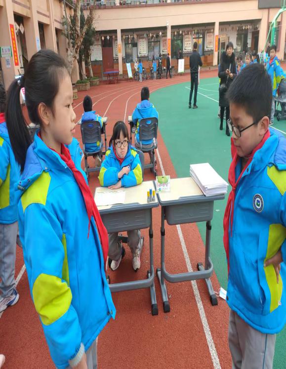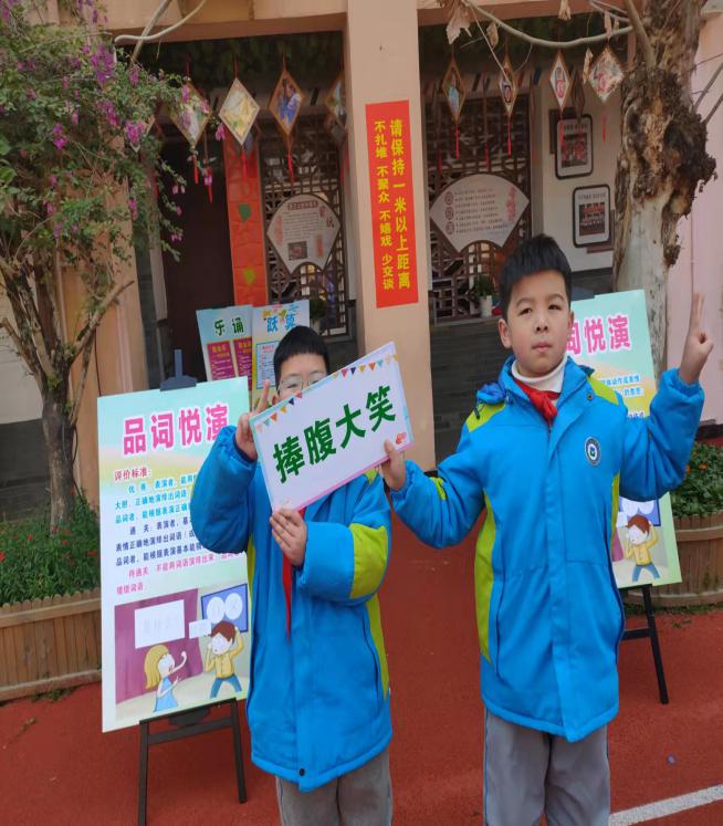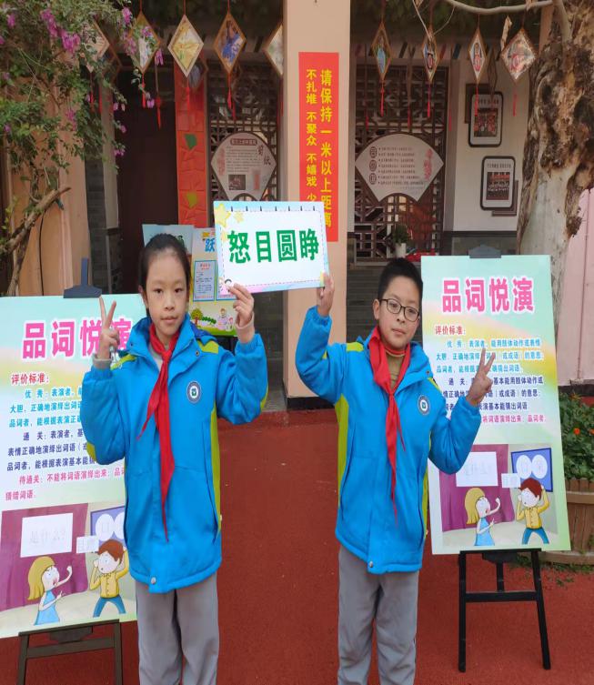 我们语文的评价内容“品词悦演”非常有趣。这是孩子们的才艺和个性展示的时刻。四位考生只需要两位考官,孩子们需要两两合作完成评价。每个考官的桌子上放有12张词条,里面写有描写神态或动作的词语(或成语)。1班和2班的考生分工合作,3班和4班的考生分工合作,一人品词,一人表演,他们商量分工。表演者抽取词条,根据词义,用肢体动作或表情演绎出意思;品词者,站在一旁观赏后,根据意思立即做出判断猜出词语(或成语)的名称。两人都完成得不错,举起词卡祝贺。