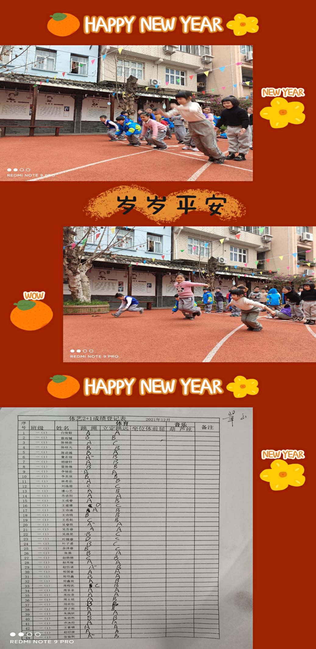 一(1)班体育1+X评价立定跳远2021.12谢翠云立定跳远是发展下肢爆发力与弹跳力的运动项目。它要求下肢与髋部肌肉协调快速用力,并与上肢的摆动相配合,所以它也需要一定的灵巧性。立定跳远具有简便易行的特点,有平地就能进行练习。因此,设定本月学生测评项目是立定跳远。测试目的:测试学生下肢肌肉爆发力及身体协调配合能力的发展水平.测试方法:学生在起跳线后起跳,两脚自然开立,静止起跳,不允许踩线,起跳时不允许助跑、垫跳。双脚必须同时起跳,双脚同时落地,以离起跳线最近点计算成绩,起跳时不能垫步或有连续移动动作,必须从静止开始起跳,测试共进行三次,记录三次中最佳成绩为最终成绩。三次犯规者,可再补跳一次。(注:如在跳后落脚地时没站稳,出现向后退,退至什么地方站稳时,成绩应算站稳后的成绩。)测试结果:一年级1班总共有44个孩子,这个月以来,我给学生们练习了多种形式的跳跃练习,最后测试了立定跳远,经过测试发现,优秀的学生16人;良好的学生21人;及格的学生7人,测试结果,发现全部都已经及格了,而且优秀良好学生将近一半多多,说明该班级学生的跳跃能力不错。应对措施:要提高立定跳远成绩,力量是基础,特别要提高膝、踝、髋三个关节的协调用力及爆发用力的能力。(l)力量因素。特别是下肢肌群的爆发用力能力,而且对踝关节的力量提出了较高的要求。因为立定跳远的最后用力点在是前脚掌(甚至是脚尖),所以需要踝关节的跖屈用力有相当大的强度。(2)协调用力的能力。指骨盆肌群与下肢肌群协调用力的能力(包括踝关节)。协调用力正确的标志是髋、膝、踝三关节能迅速有力地蹬直,上肢能做出协调的摆动,起到带、领、提拉的作用。(3)臂的摆动作用。立定跳远必须直臂摆动,摆幅越大,带、领、提、拉动作越强。请注意观察,凡屈臂摆动者,必然造成上体的波浪动作,从而影响跳的远度。(4)能量的转换。从站立状态到下蹲状态,势能转化为动能,这样就相当于有一定的助跑,从而可以更有效地提高初速度,增加跳远的远度。训练手段:1、蹲跳起 2、单脚交换跳 3、蹍跳步 4、纵跳摸高 5、蛙跳6、障碍跳 7、跳台阶 8、冰棍跳 9、挺身跳 10、收腹跳